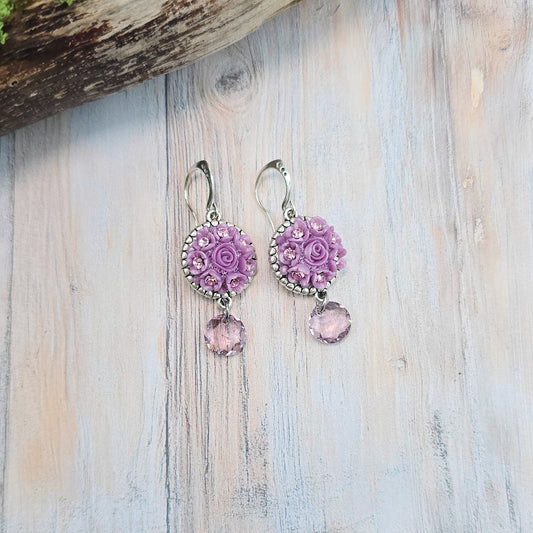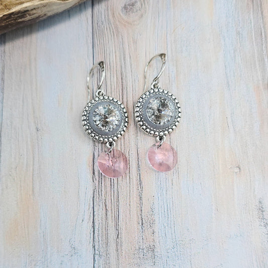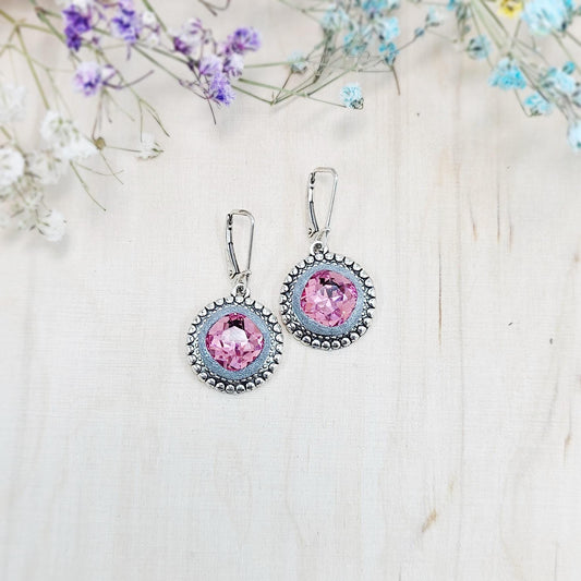 Minimalistiniai auskarai su rožiniais kristalais ir sidabriniais kabliukais