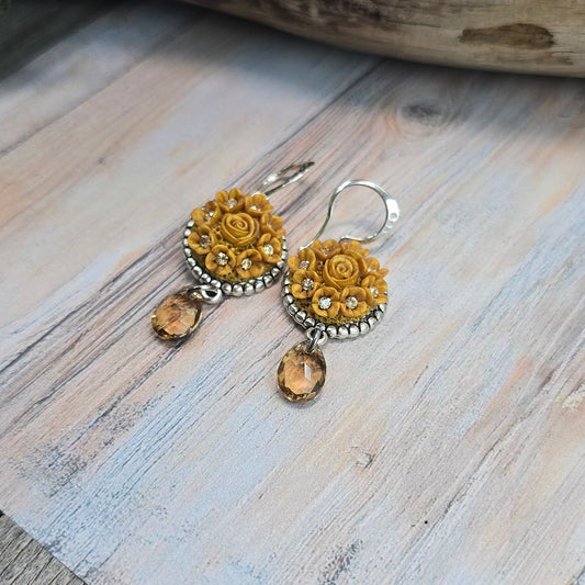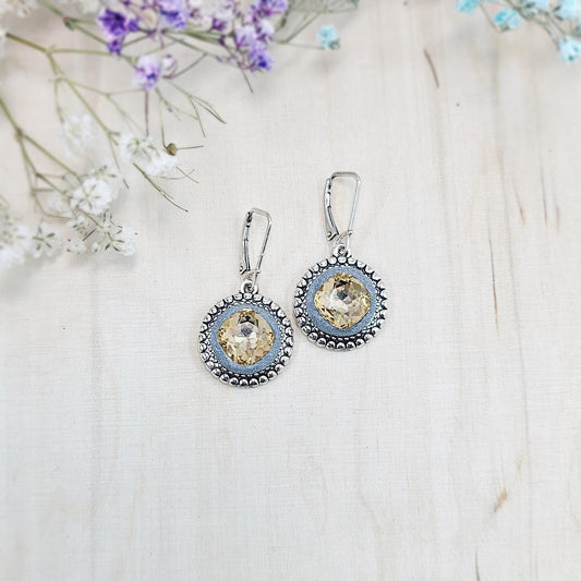 Minimalistiniai auskarai su medaus spalvos kristalais ir sidabriniais kabliukais