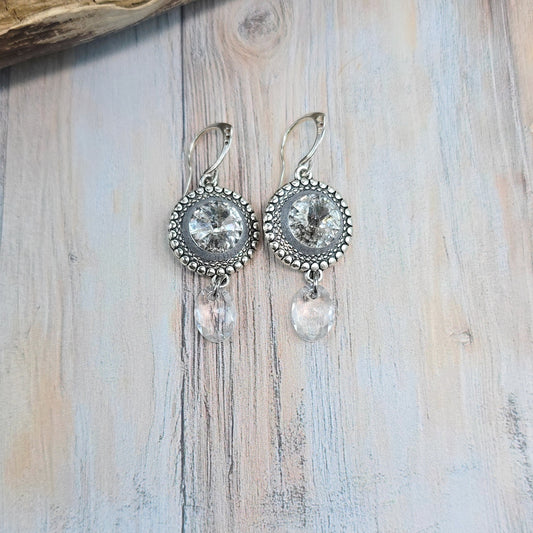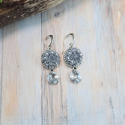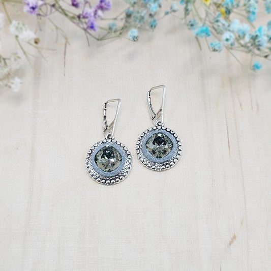 Minimalistiniai auskarai su pilkais kristalais ir sidabriniais kabliukais