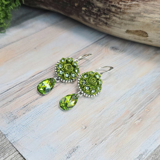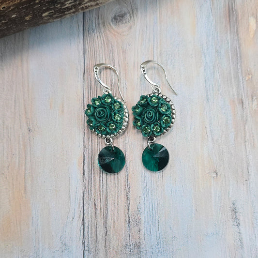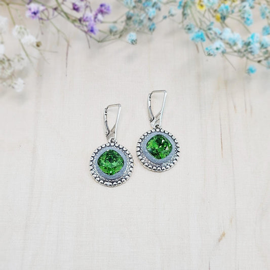 Minimalistiniai žali auskarai su kristalais ir sidabriniais kabliukais