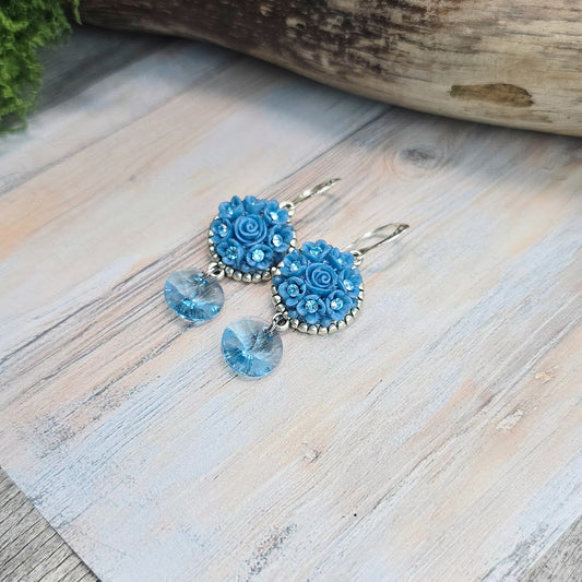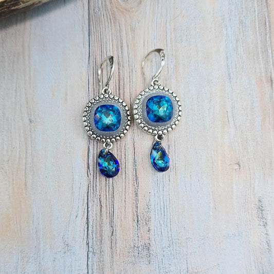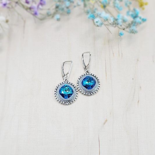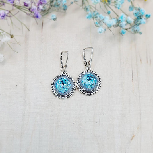 Minimalistiniai mėlyni auskarai su kristalais ir sidabriniais kabliukais
