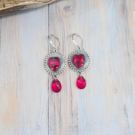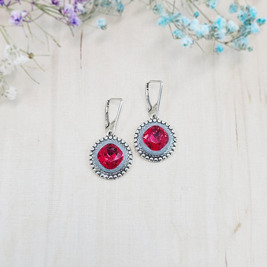 Minimalistiniai auskarai su raudonais kristalais ir sidabriniais kabliukais