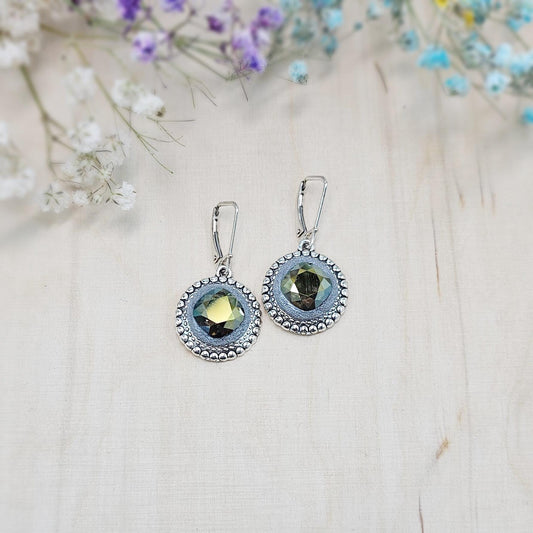 Minimalistiniai auskarai su žalsvais 'Skarabėjaus efekto' kristalais ir sidabriniais kabliukais