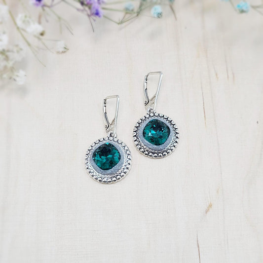 Minimalistiniai auskarai su smaragdo spalvos kristalais ir sidabriniais kabliukais
