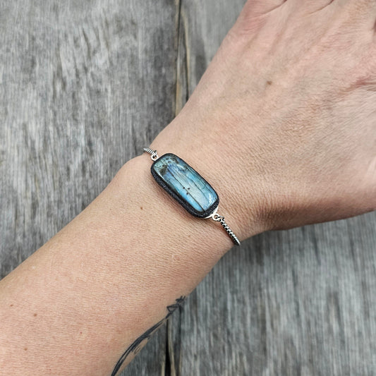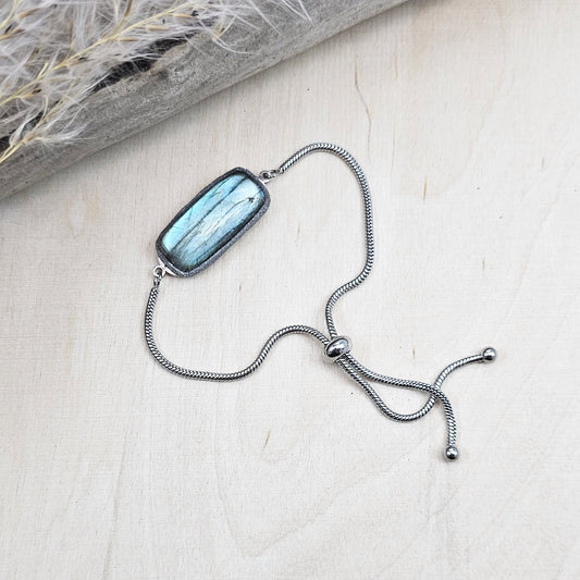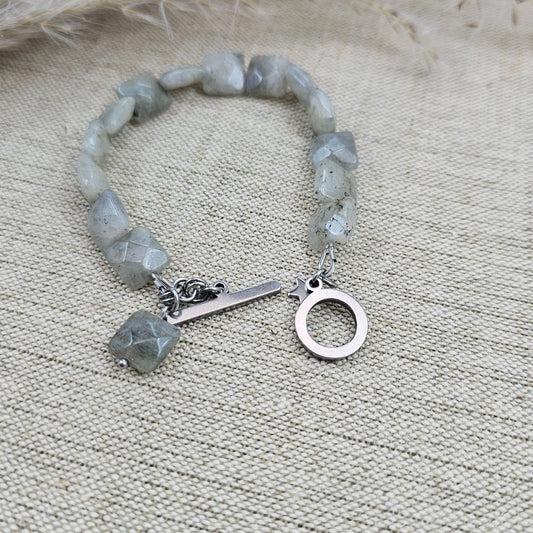 Minimalistinė apyrankė su labradoritu. Nerūdijantis plienas, polimerinis molis