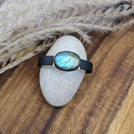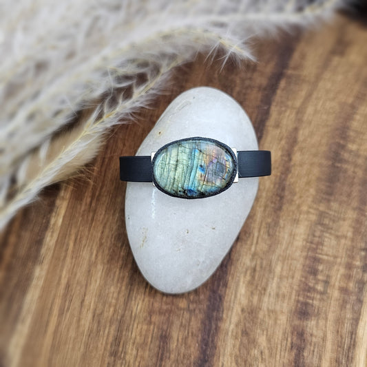 Apyrankė su labradoritu ir juodu kaučiuko dirželiu