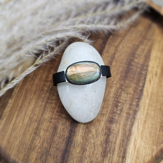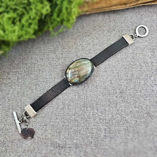 Rudų atspalvių labradorito apyrankė su juodu odiniu dirželiu