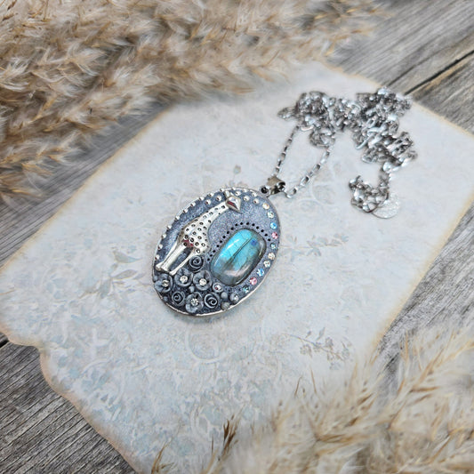 Dvipusis pakabukas su labradoritu ir kate ant mėnulio.