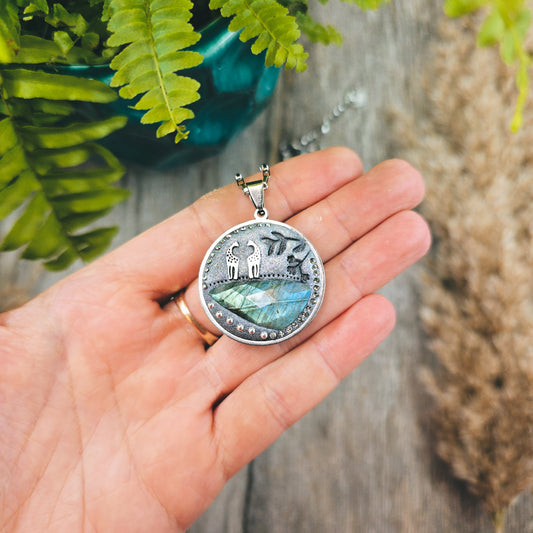 Dvipusis pakabukas medalionas su labradoritu ir žirafom