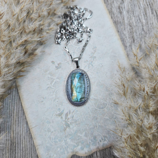 Minimalistinis pakabukas su labradoritu. Nerūdijančio plieno grandinėlė.
