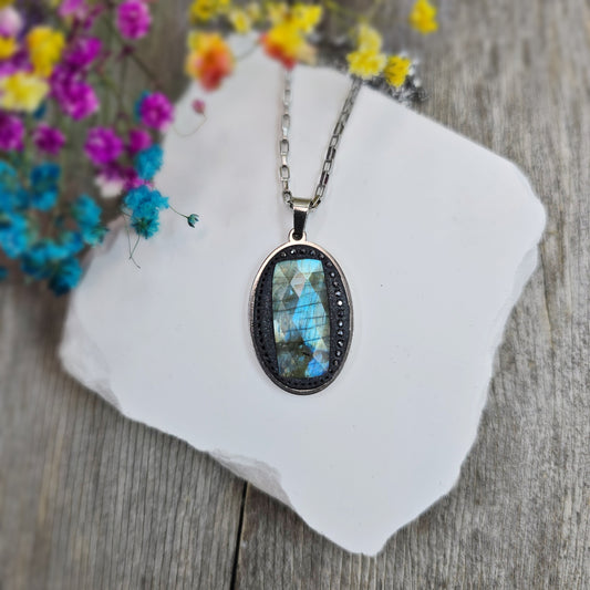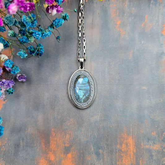 Nerūdijančio plieno pakabukas su facetuotu labradoritu