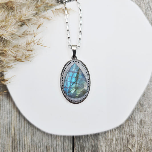 Minimalistinis nerūdijančio plieno pakabukas su labradorito lašeliu