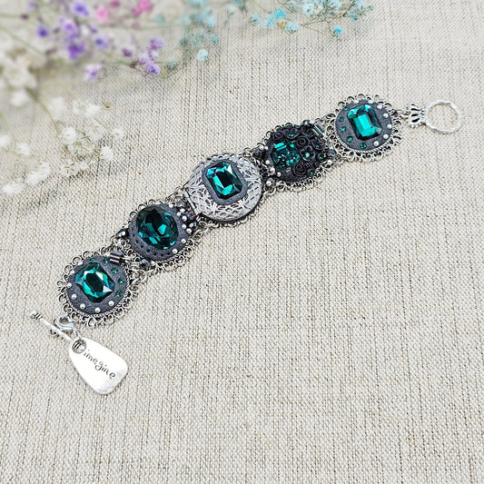 Plati apyrankė su sodriais smaragdo spalvos kristalais ir atsidarančiu medalionu