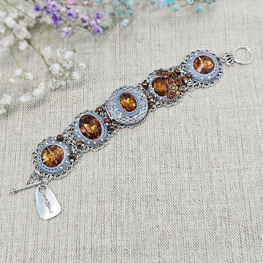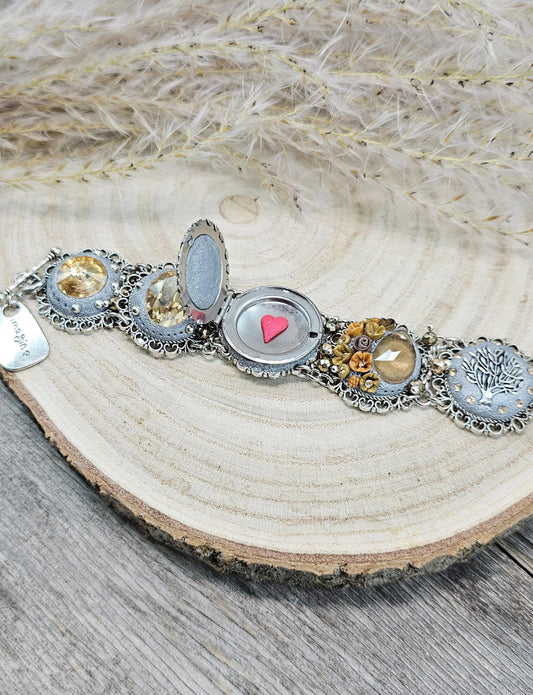 Plati apyrankė su medaus spalvos kristalais ir atsidarančiu medalionu