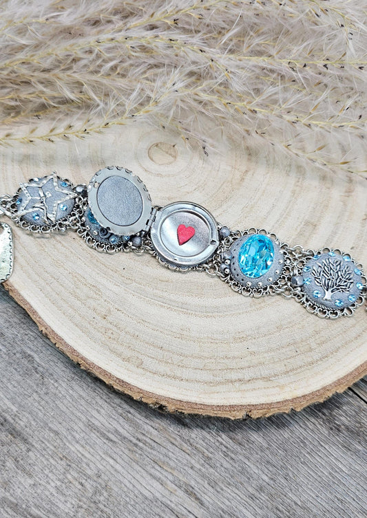 Plati apyrankė su turkio žydrumo spalvos kristalais ir atsidarančiu medalionu