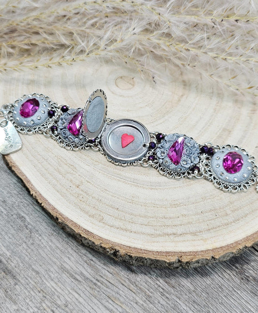 Plati apyrankė su fuksijos spalvos kristalais ir atsidarančiu medalionu