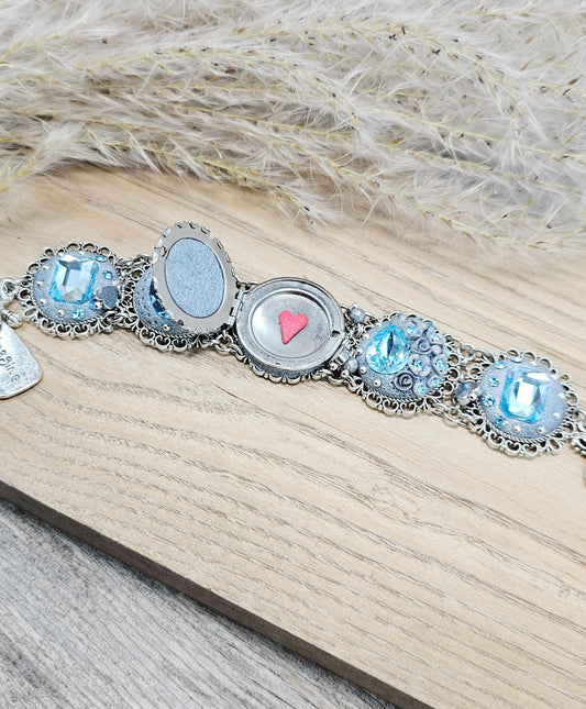 Dangaus spalvos apyrankė su kristalais ir atsidarančiu medalionu