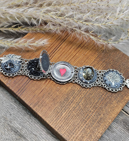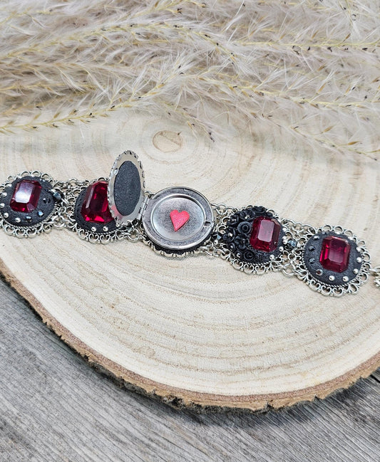 Raudona + Juoda apyrankė su kristalais ir atsidarančiu medalionu