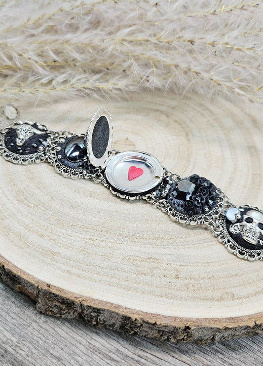 Brutali juoda apyrankė su kristalais, hematitu, atsidarančiu medalionu ir kaukolės detalėmis