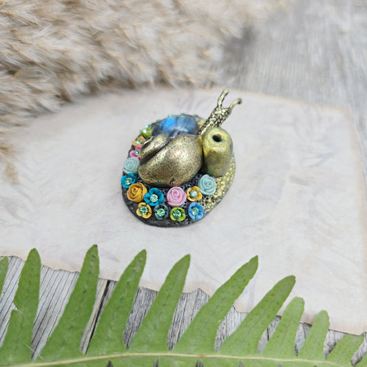 Smilkaline su labradoritu ir sraige tarp gėlyčių