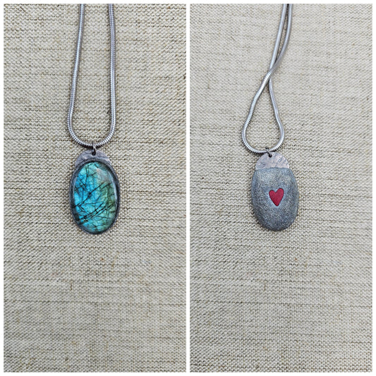 Pakabukas su labradoritu ir širdele kitoje pusėje