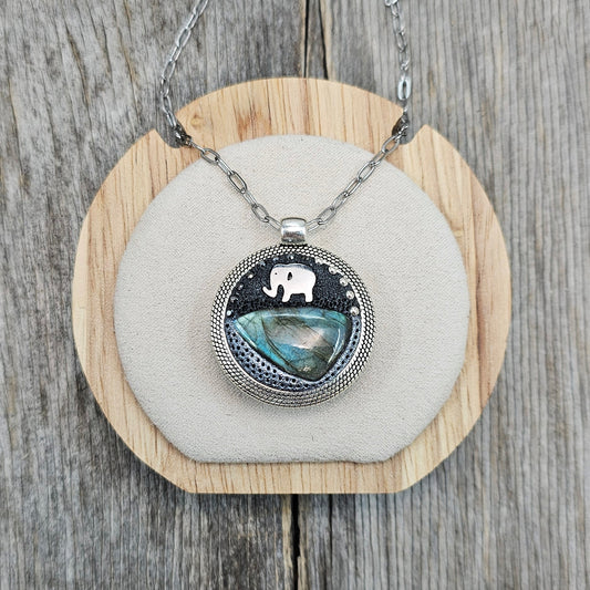 Pakabukas su labradoritu ir drambliuku. Nerūdijantis plienas, polimerinis molis.