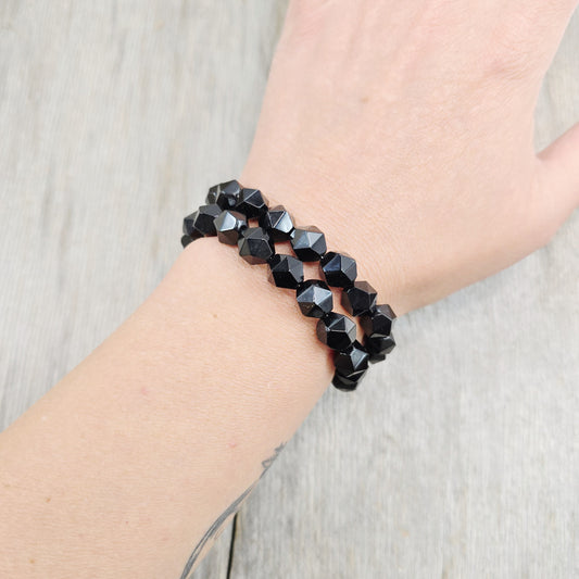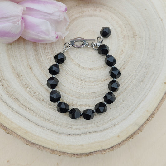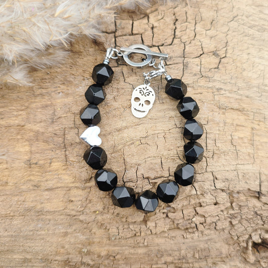 Juoda onikso apyrankė su širdele ir cukrine kaukole