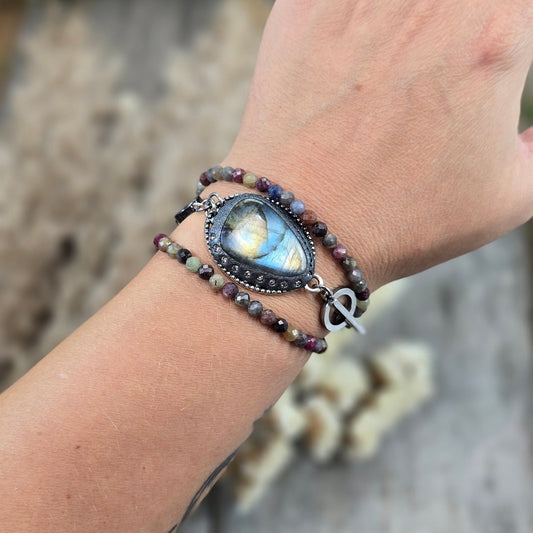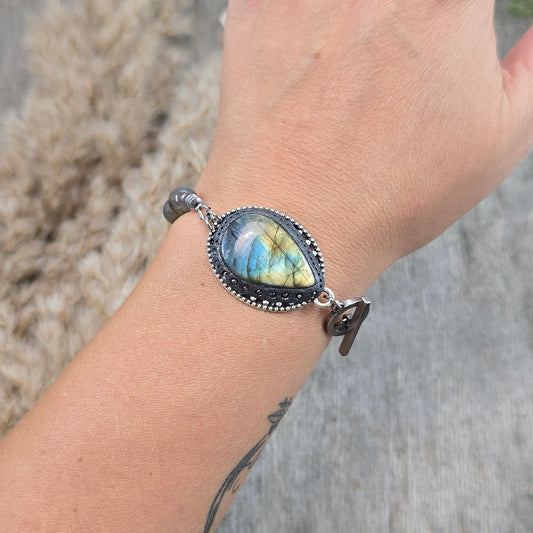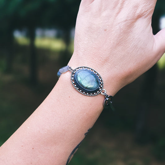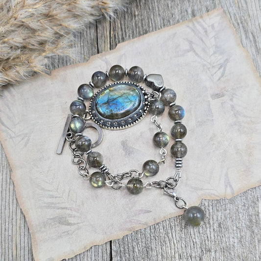 IšparduotaLabradorito apyrankė su 'cukrine kaukole'