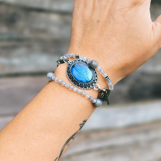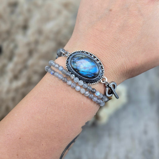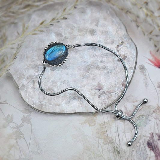 Minimalistinė apyrankė su labradoritu. Nerūdijantis plienas, polimerinis molis
