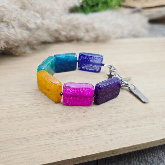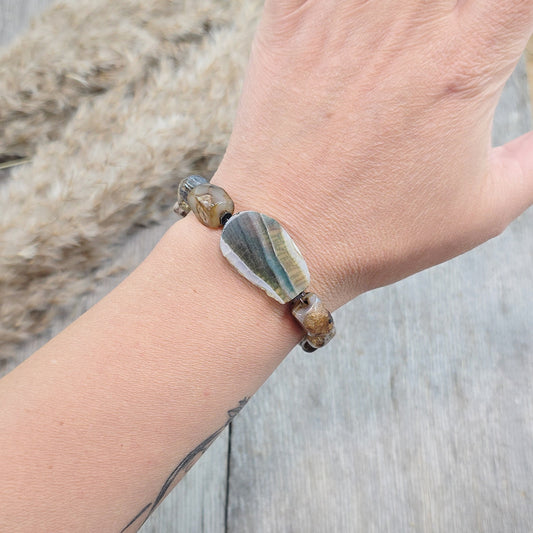 Svalvota ryški, stambių akmenukų apyrankė su agatais ir kačiuku