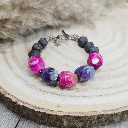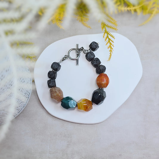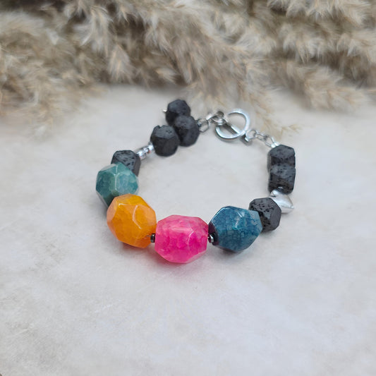 Svalvota ryški, stambių akmenukų apyrankė su agatais ir lava