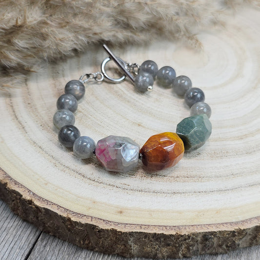 Svalvota ryški, stambių akmenukų apyrankė su agatais ir labradoritu