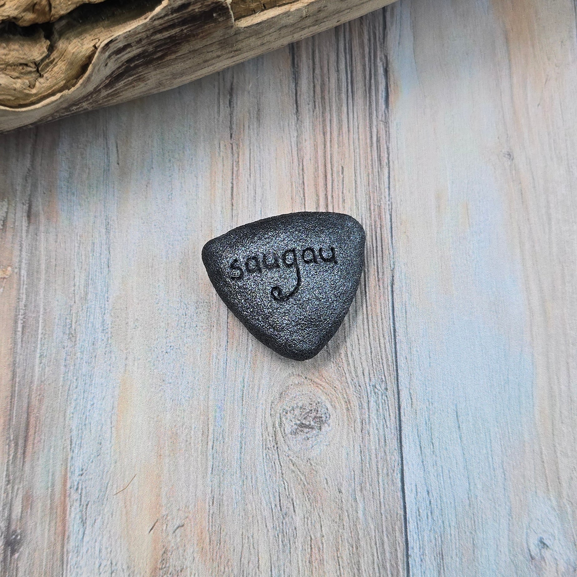 Akmenukas „įrėmintas“ polimerinio molio pagalba – tai tvirta, patvari medžiaga, užtikrinanti, kad tavo lobis išliktų ilgaamžis. Jo nugarėlėje ranka įspaustas žodis „saugau“ – paprasta, bet labai galinga žinutė. 🖤