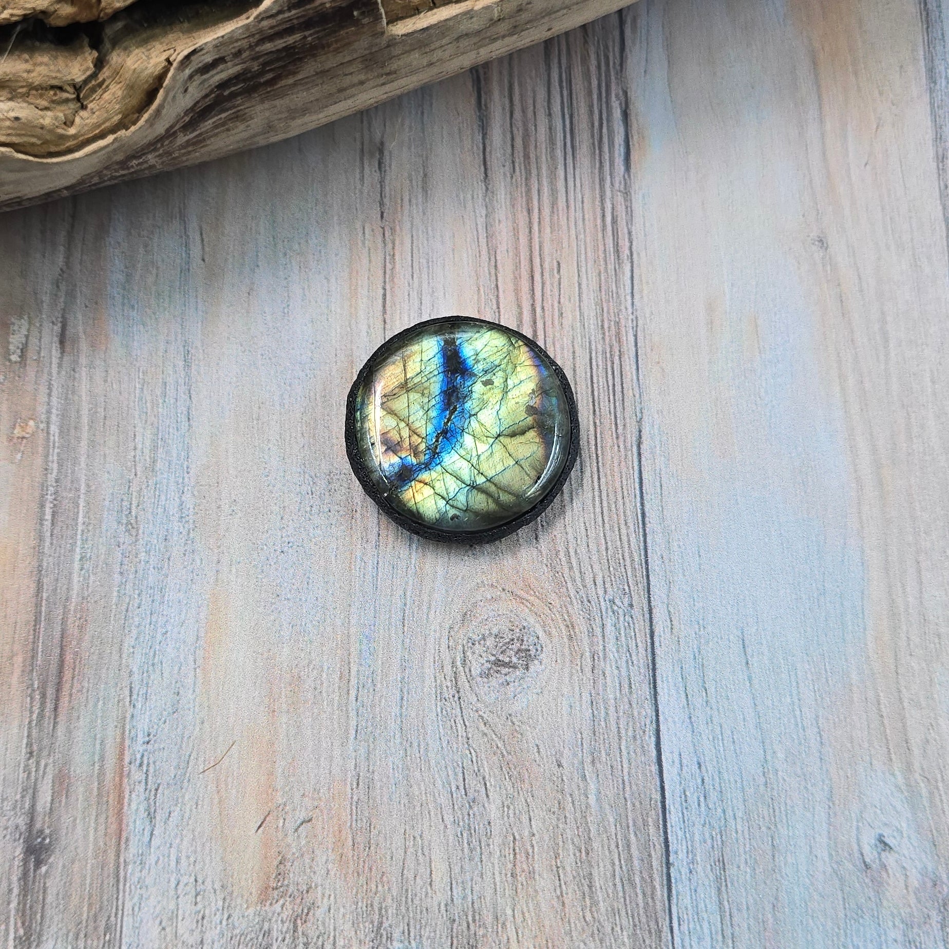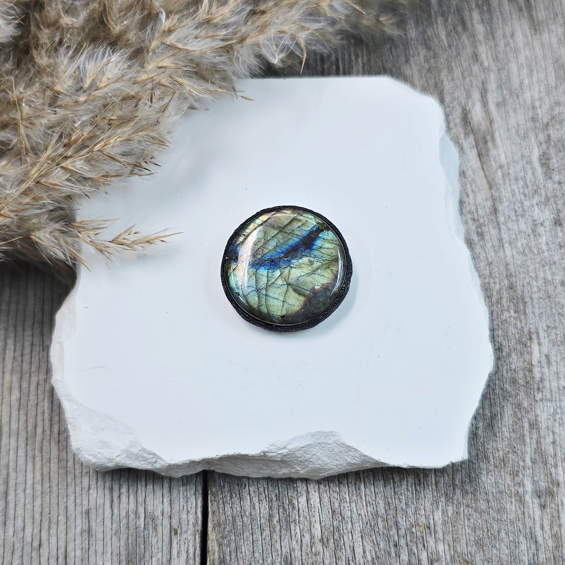 Šis nuostabus rankų darbo akmenukas su labradoritu sukurtas būti tavo kasdieniu palydovu ir apsaugos simboliu. Kiekvienas jo blyksnis – tai šviesos žinutė iš nematomo pasaulio. 💙