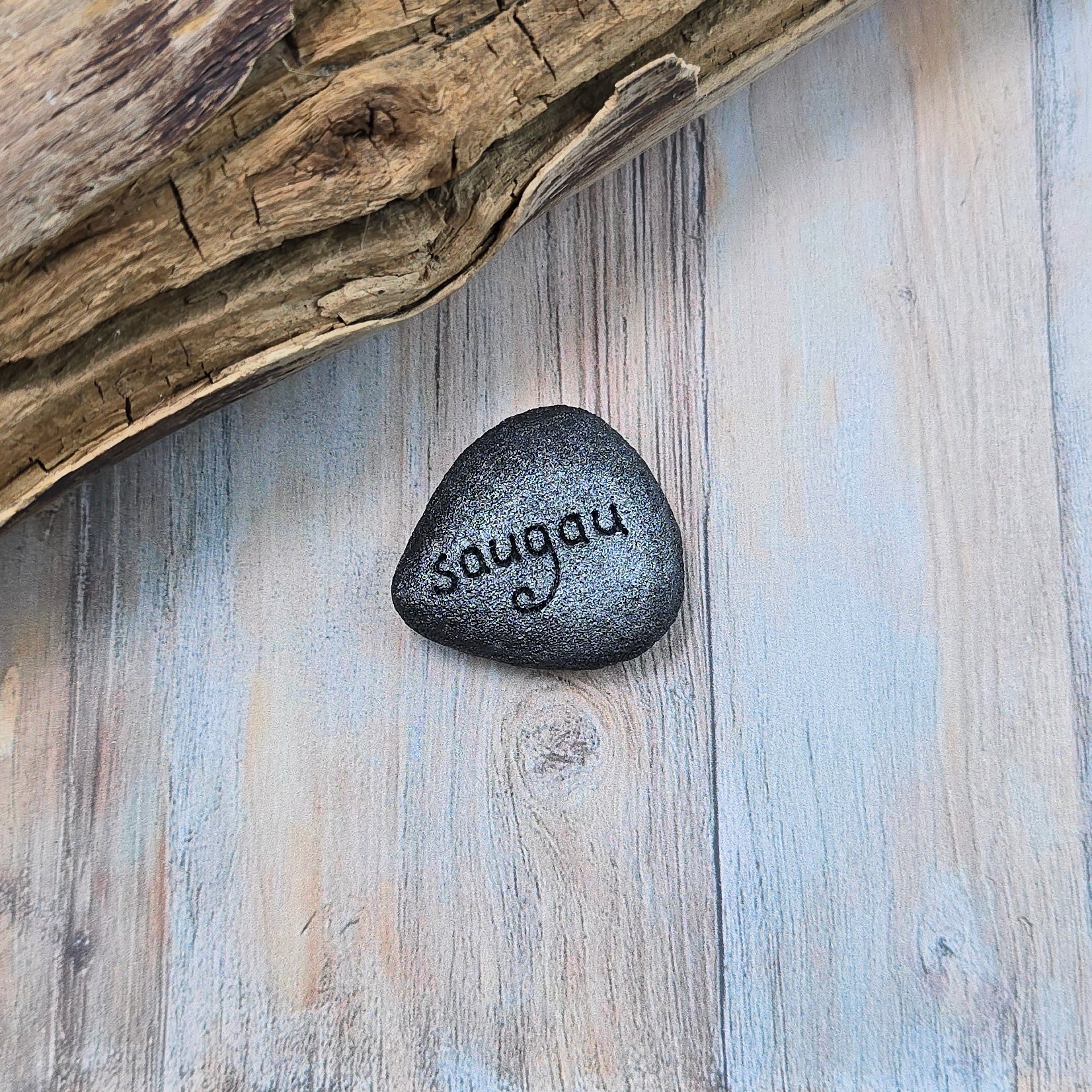 Akmenukas „įrėmintas“ polimerinio molio pagalba – tai tvirta, patvari medžiaga, užtikrinanti, kad tavo lobis išliktų ilgaamžis. Jo nugarėlėje ranka įspaustas žodis „saugau“ – paprasta, bet labai galinga žinutė. 🖤