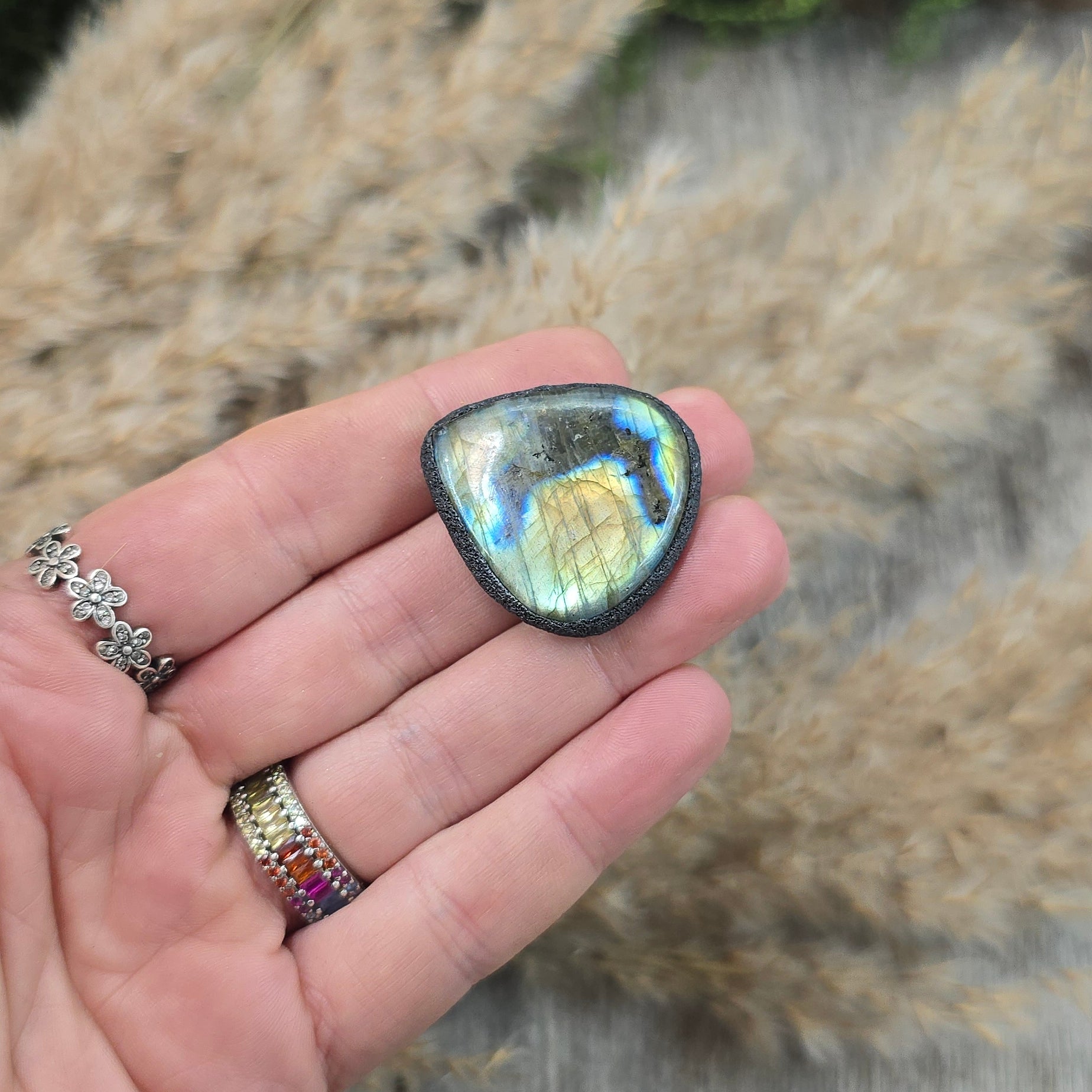 Šis nuostabus rankų darbo akmenukas su labradoritu sukurtas būti tavo kasdieniu palydovu ir apsaugos simboliu. Kiekvienas jo blyksnis – tai šviesos žinutė iš nematomo pasaulio. 💙