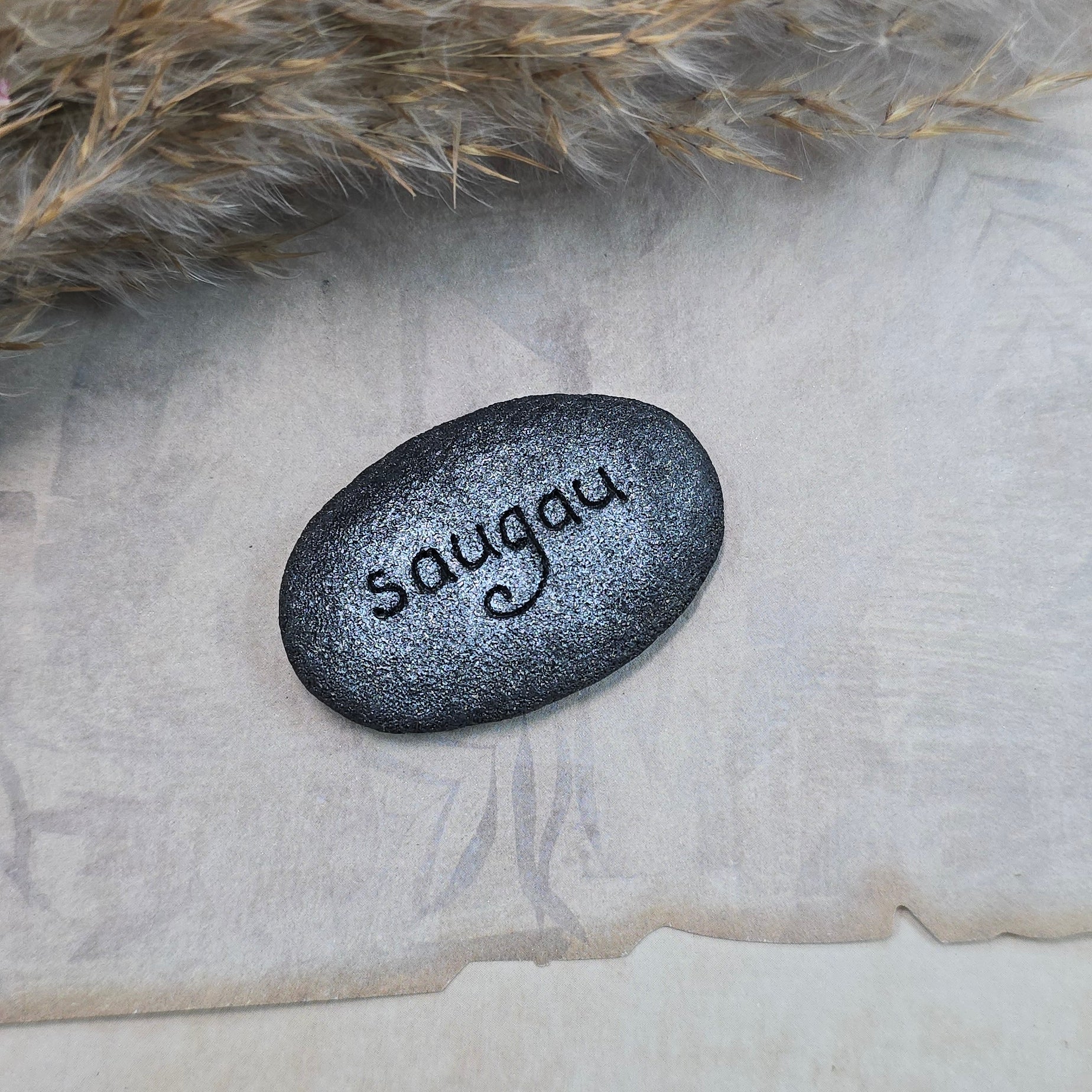 Akmenukas „įrėmintas“ polimerinio molio pagalba – tai tvirta, patvari medžiaga, užtikrinanti, kad tavo lobis išliktų ilgaamžis. Jo nugarėlėje ranka įspaustas žodis „saugau“ – paprasta, bet labai galinga žinutė. 🖤