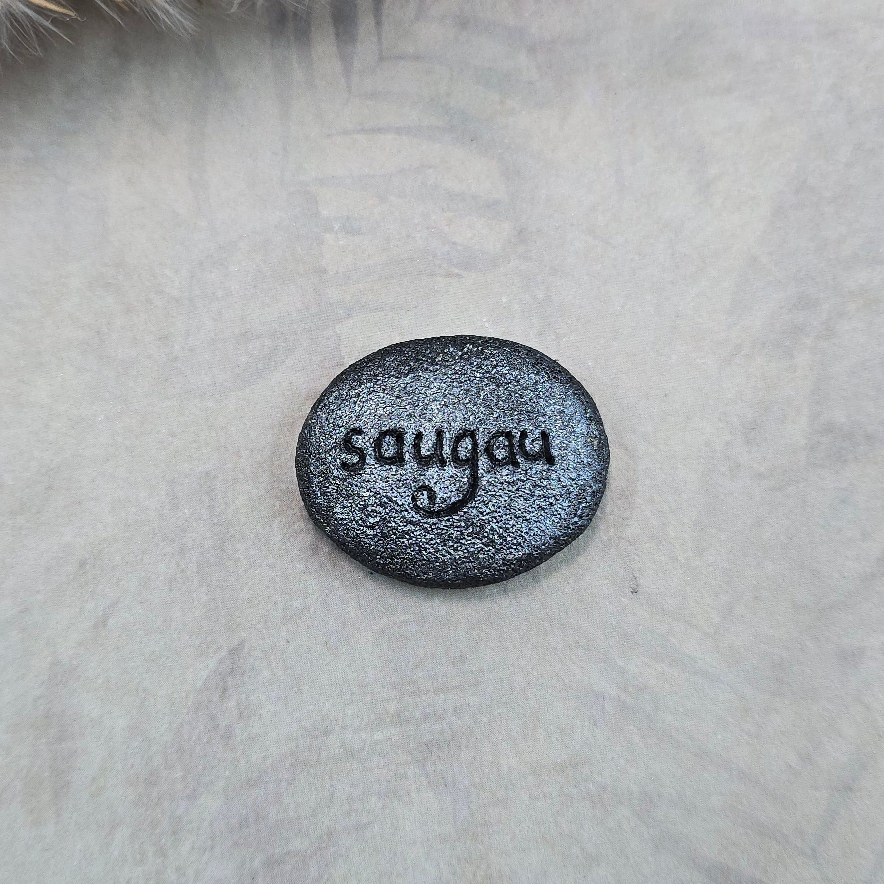Akmenukas „įrėmintas“ polimerinio molio pagalba – tai tvirta, patvari medžiaga, užtikrinanti, kad tavo lobis išliktų ilgaamžis. Jo nugarėlėje ranka įspaustas žodis „saugau“ – paprasta, bet labai galinga žinutė. 🖤