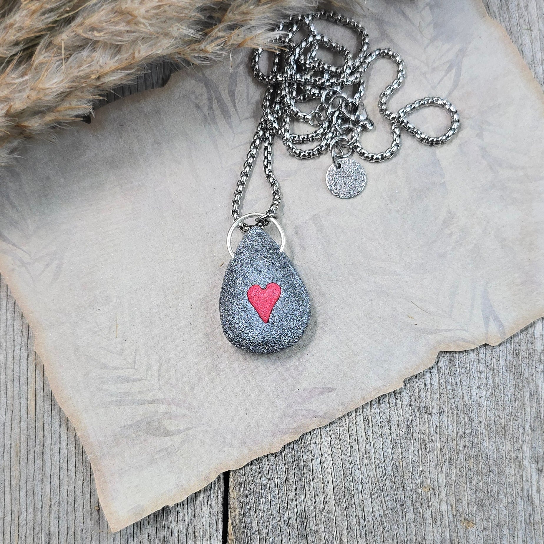 ⦁ Akmenukas 'įrėmintas' polimerinio molio pagalba. Pilka dalis - tai polimerinis molis - patvari kieta medžiaga. Jo dėka akmenukas pritvirtintas prie metalinės detalės.