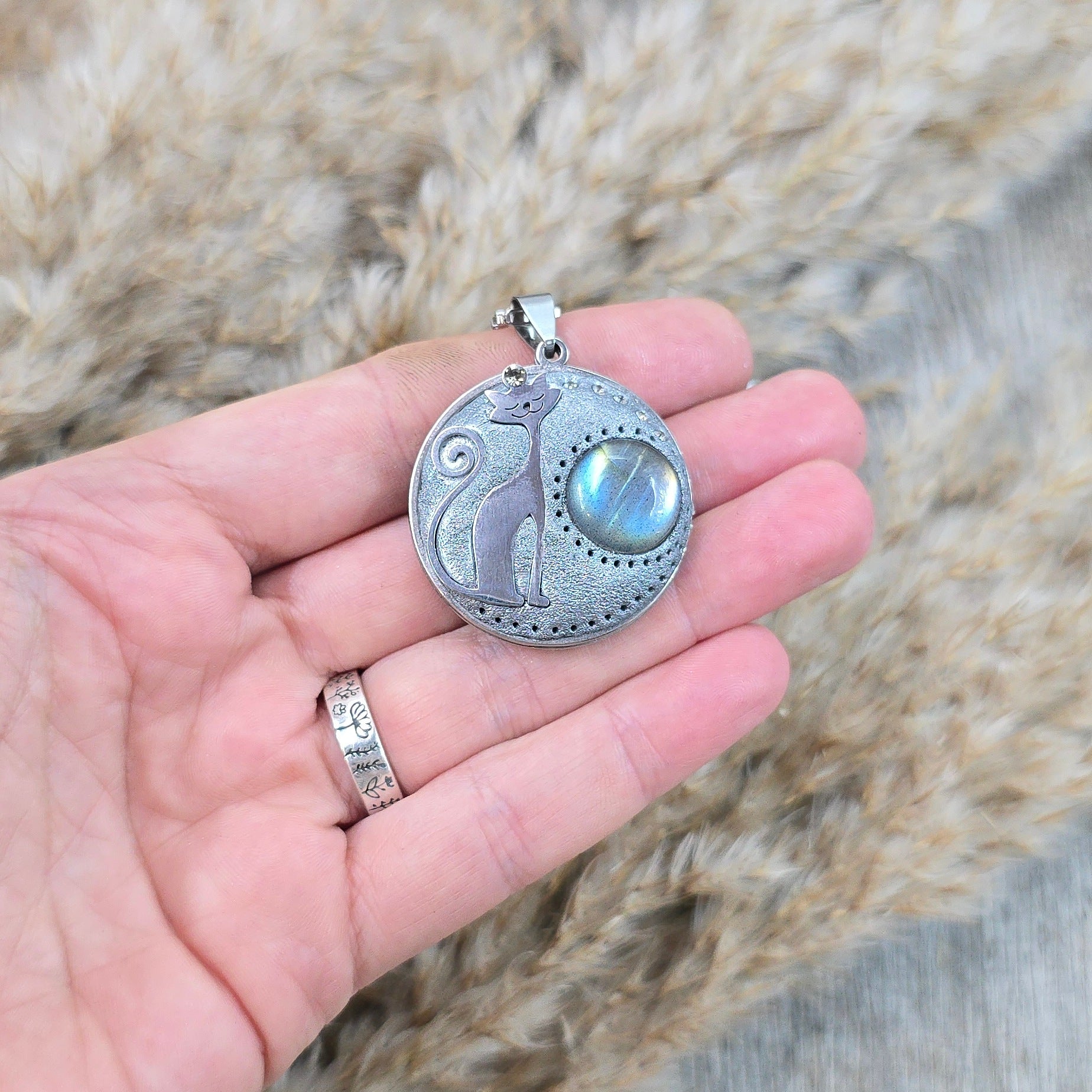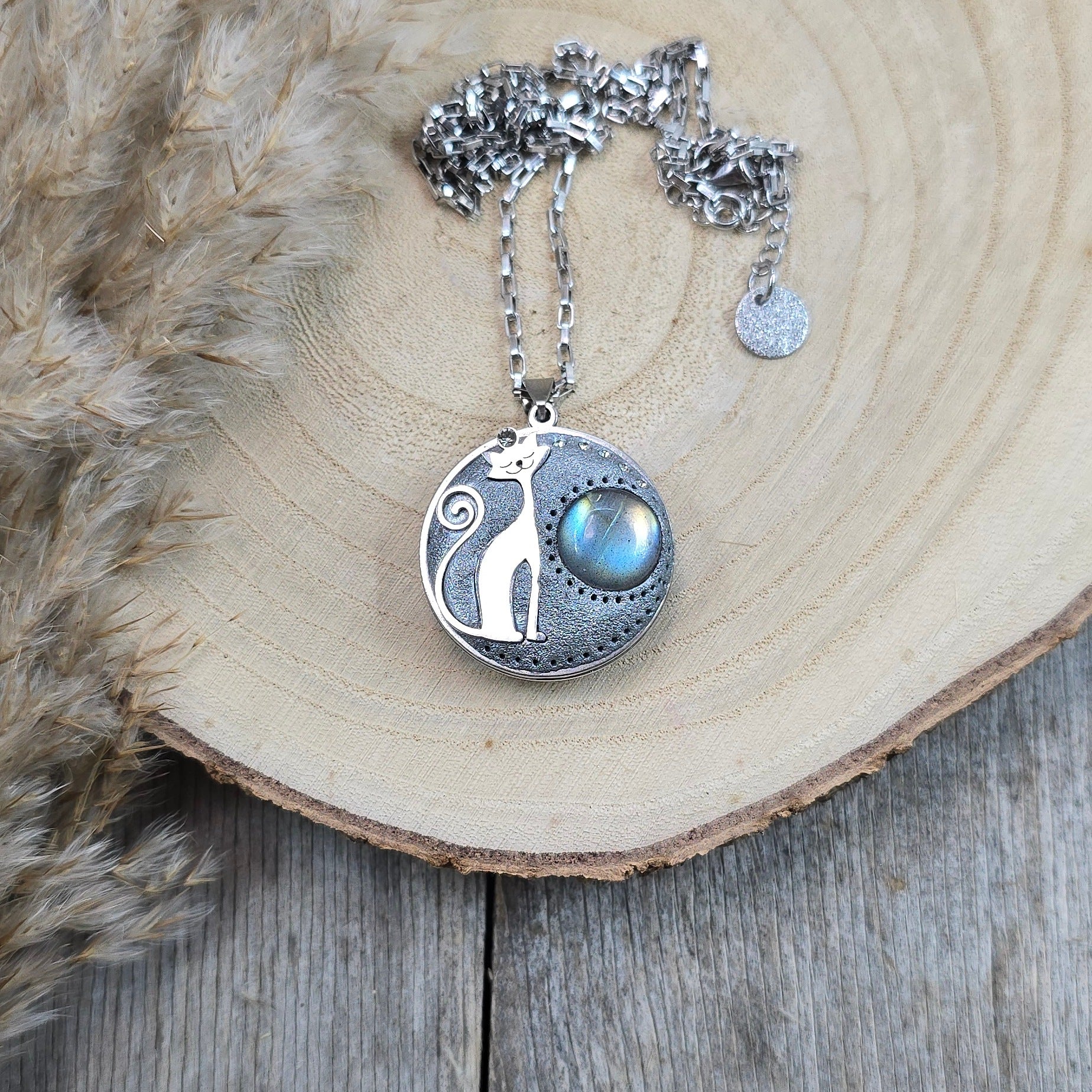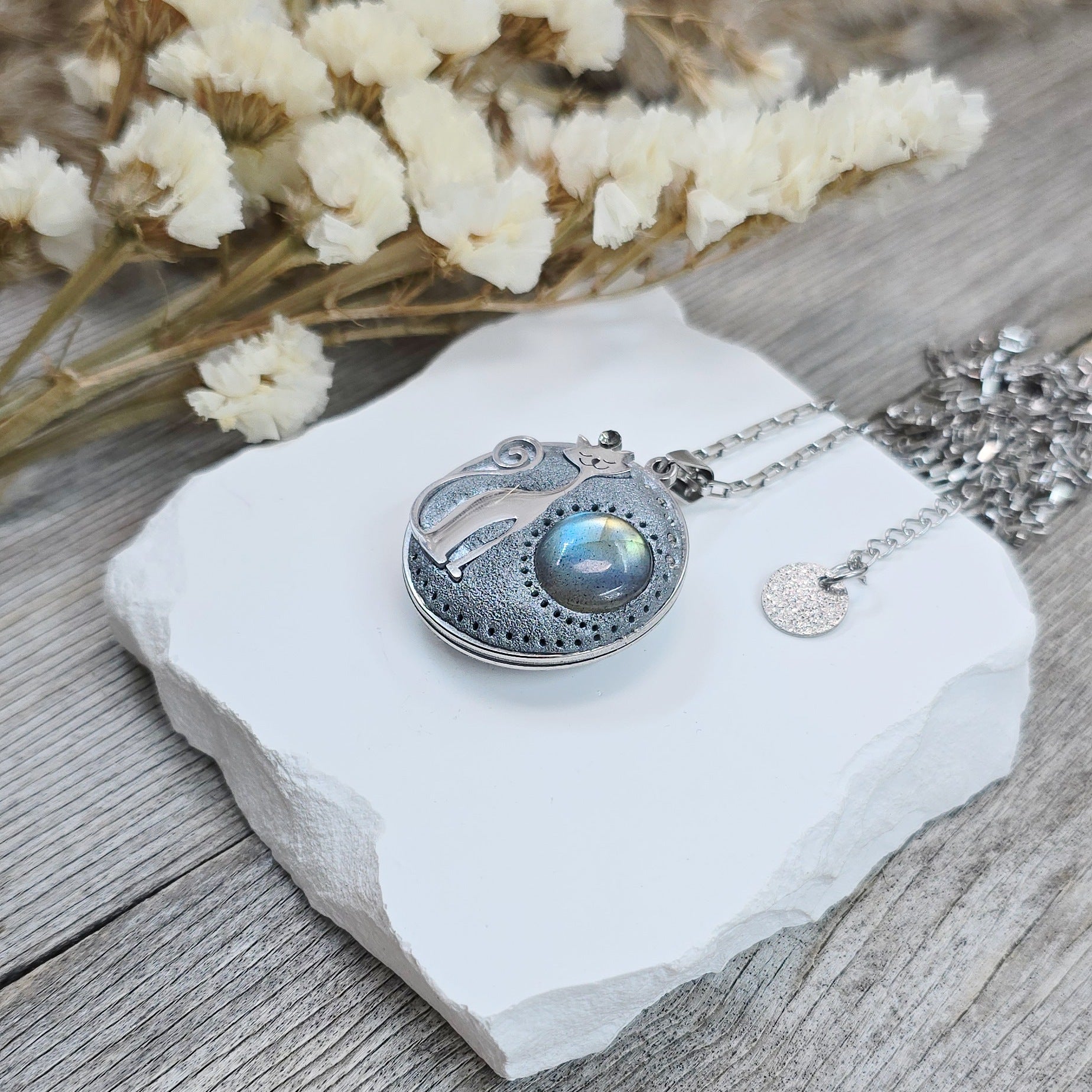 Labradorito pakabukas su atsidarančiu medalionu kitoje pusėje