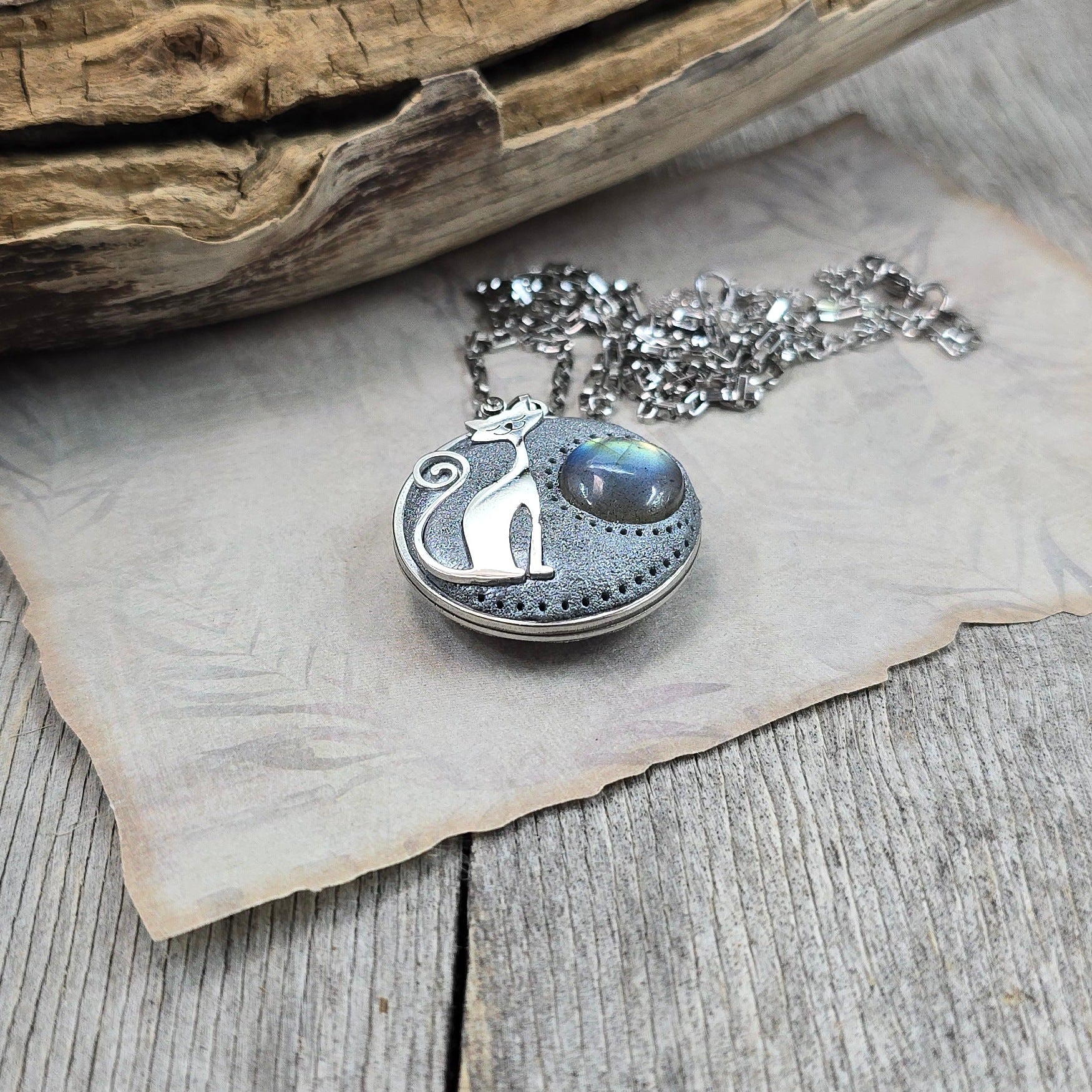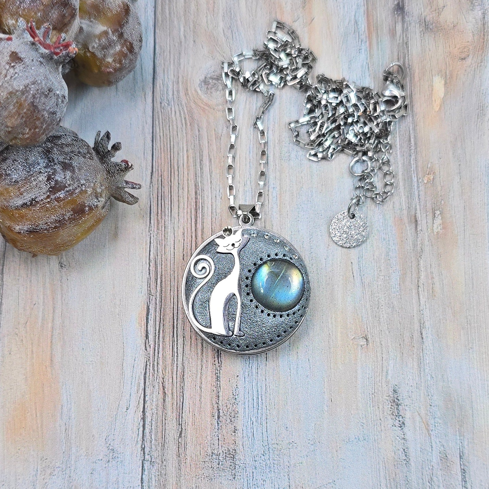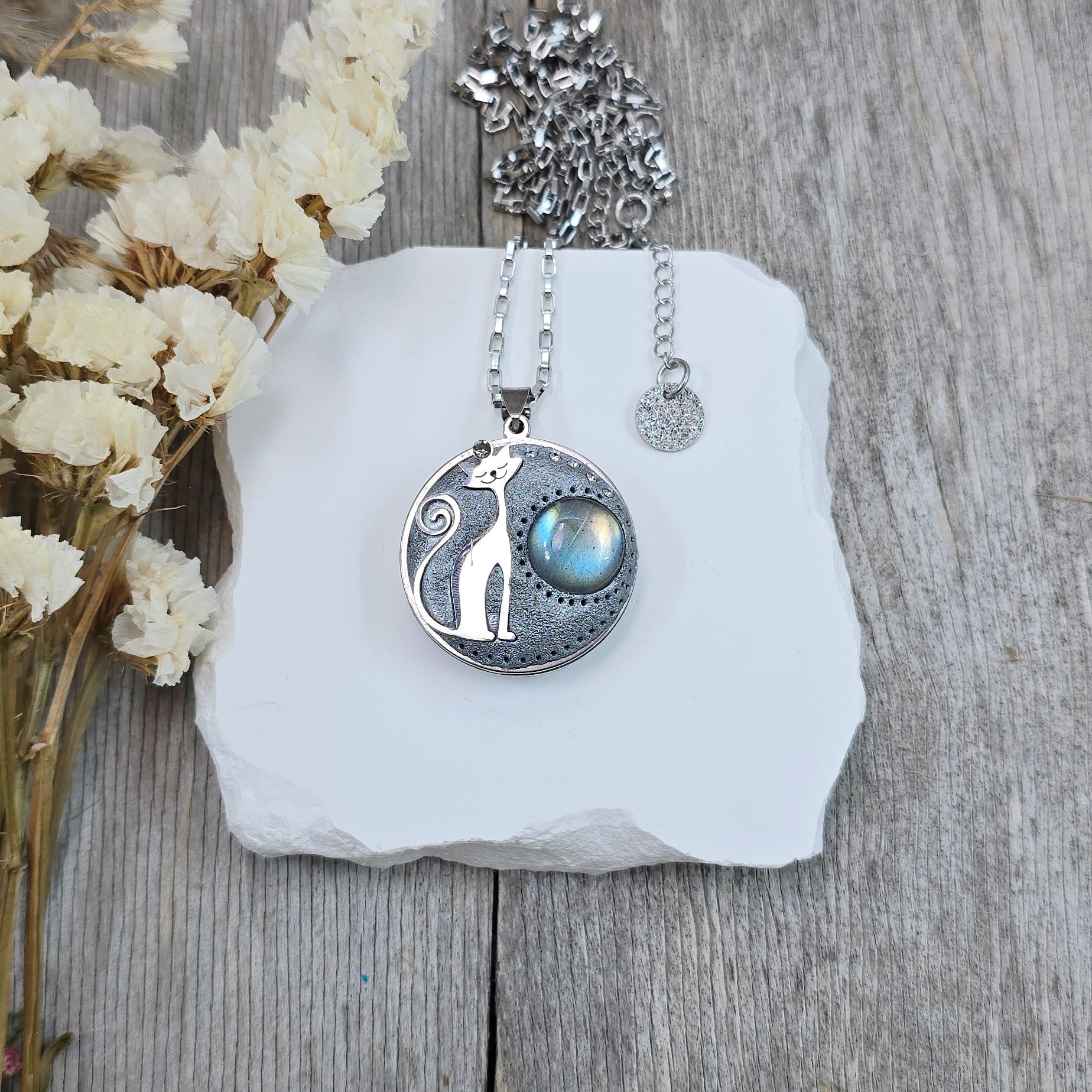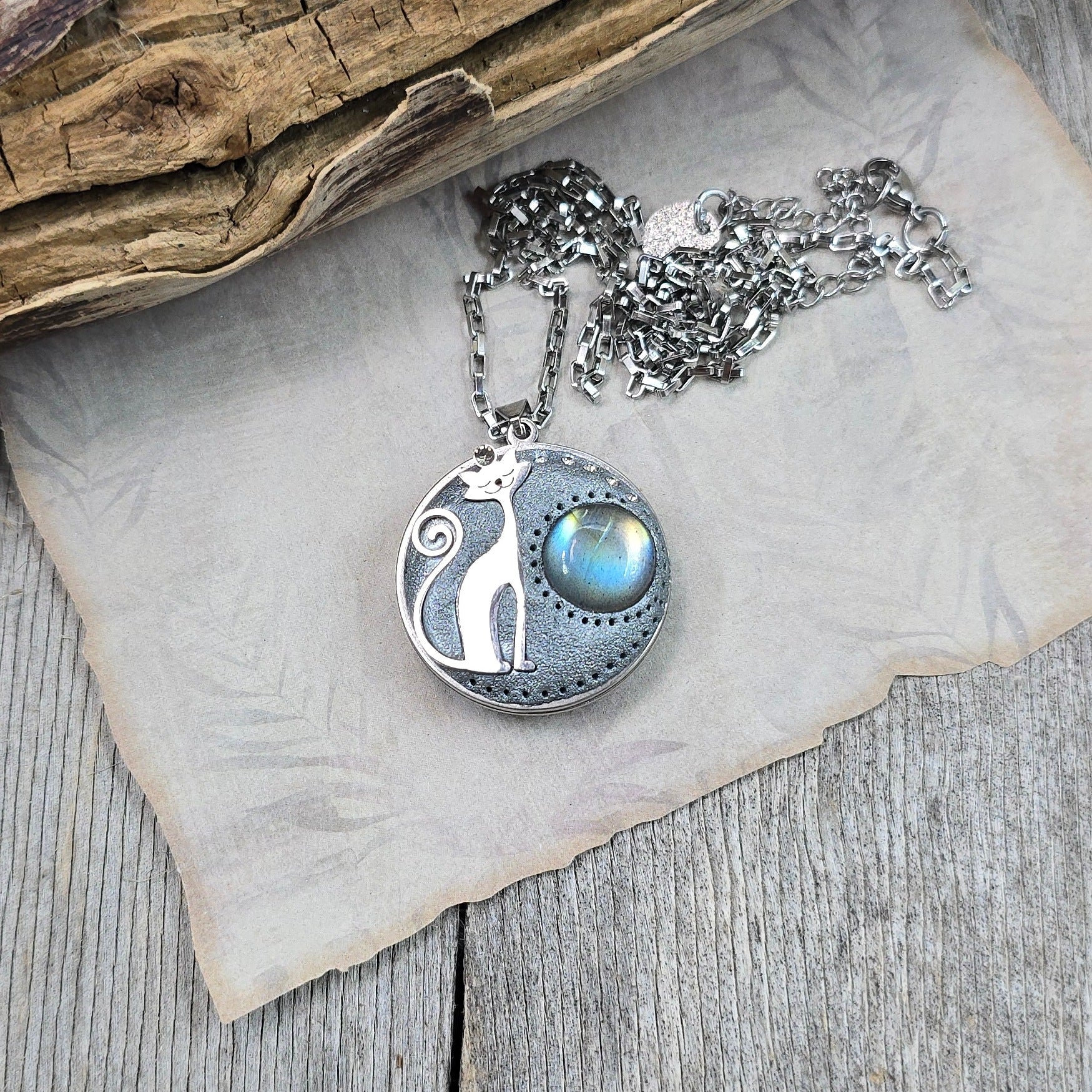 Labradorito pakabukas su atsidarančiu medalionu kitoje pusėje