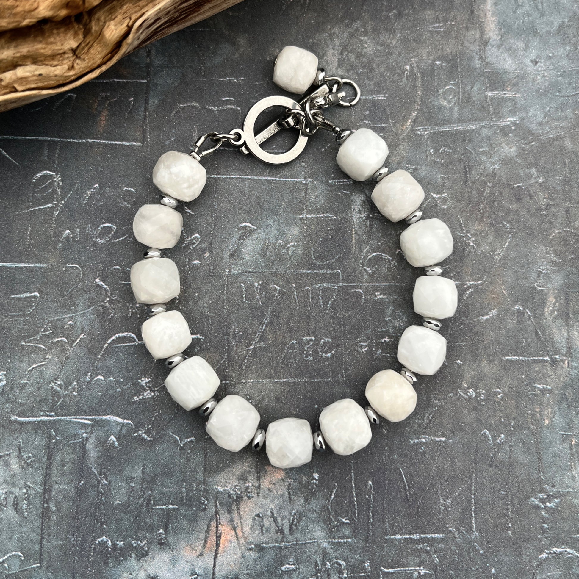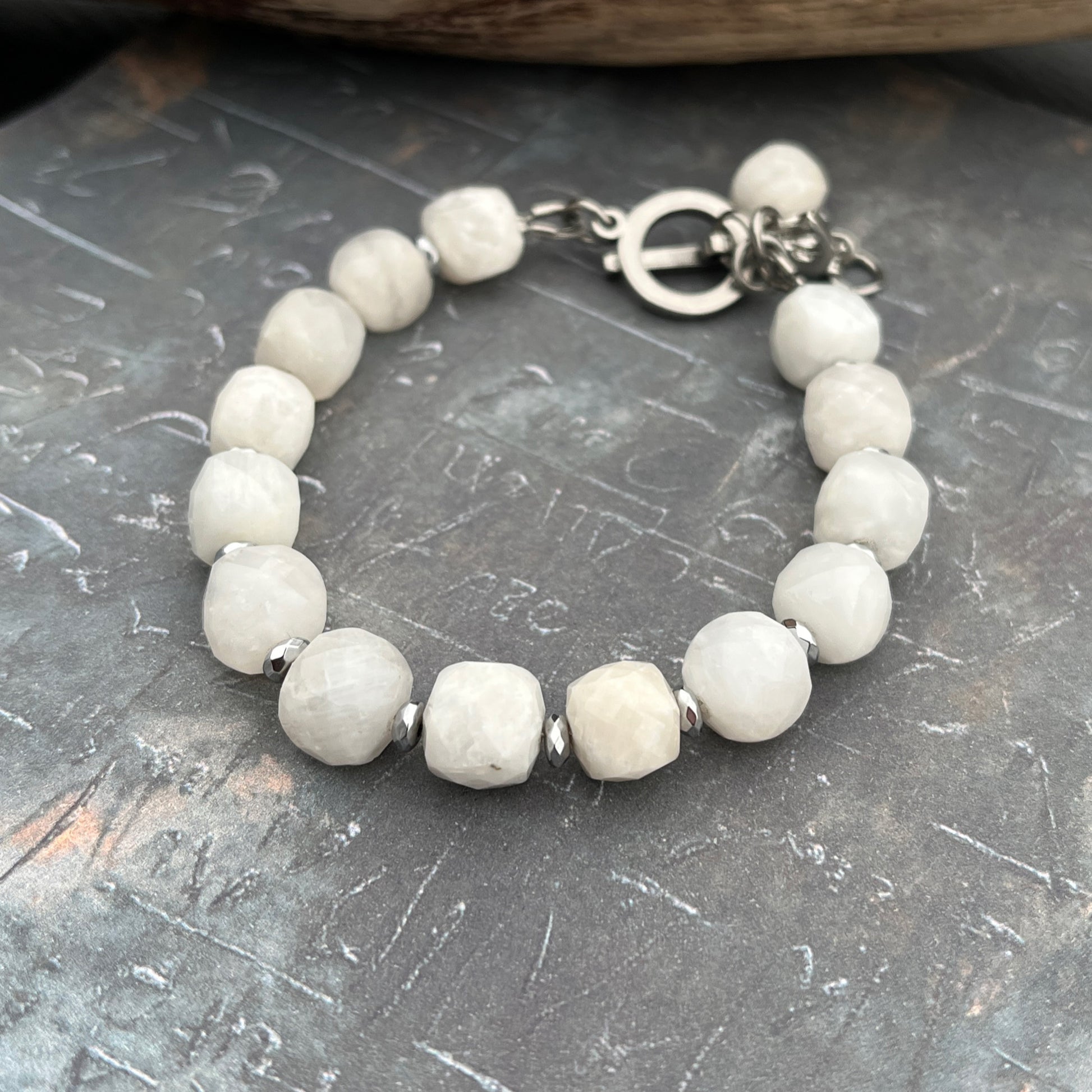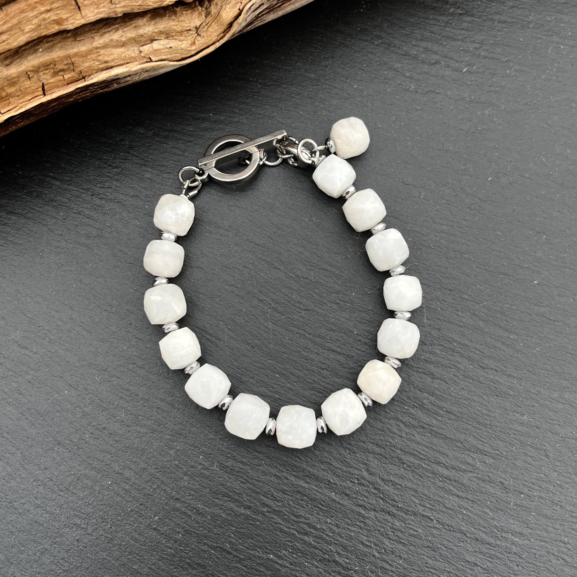 Balta apyrankė su briaunotais mėnulio akmenukais (melsvumo neturi).