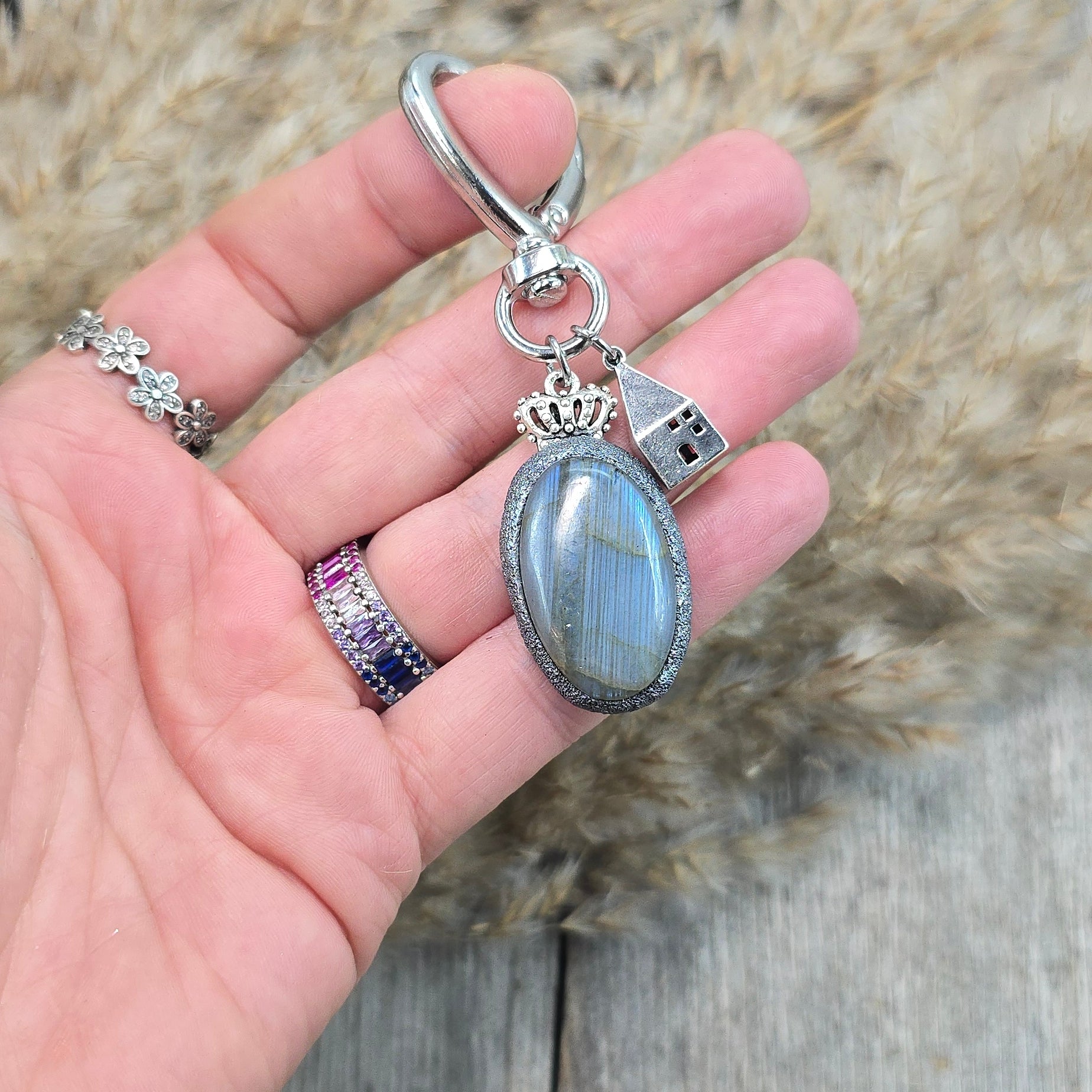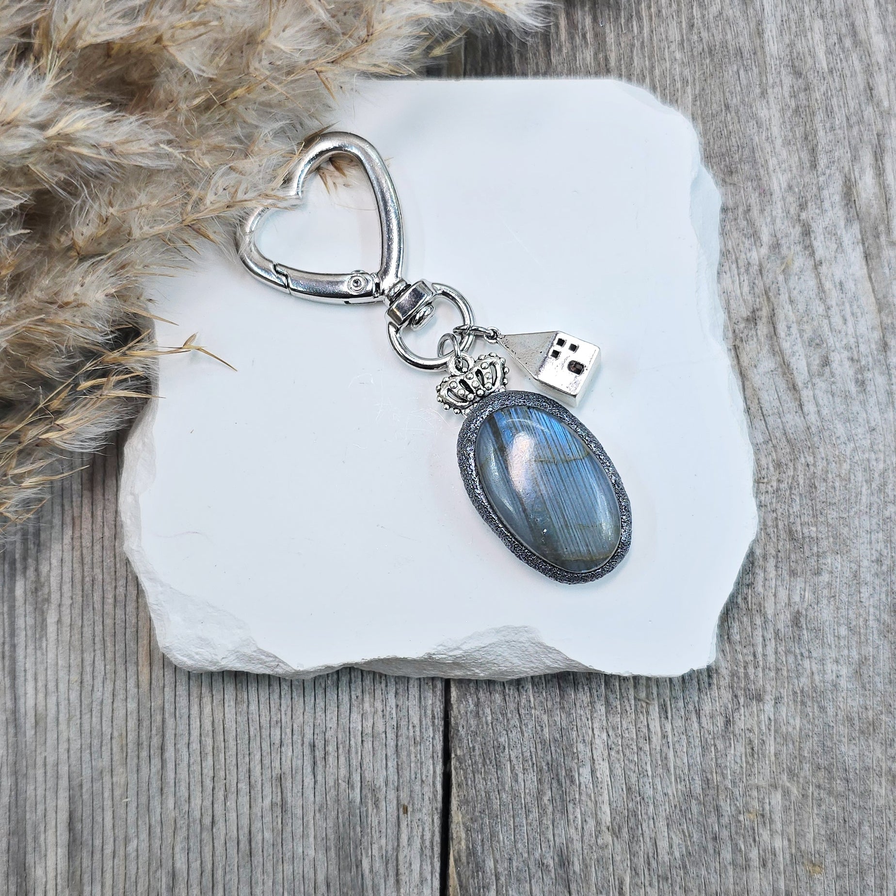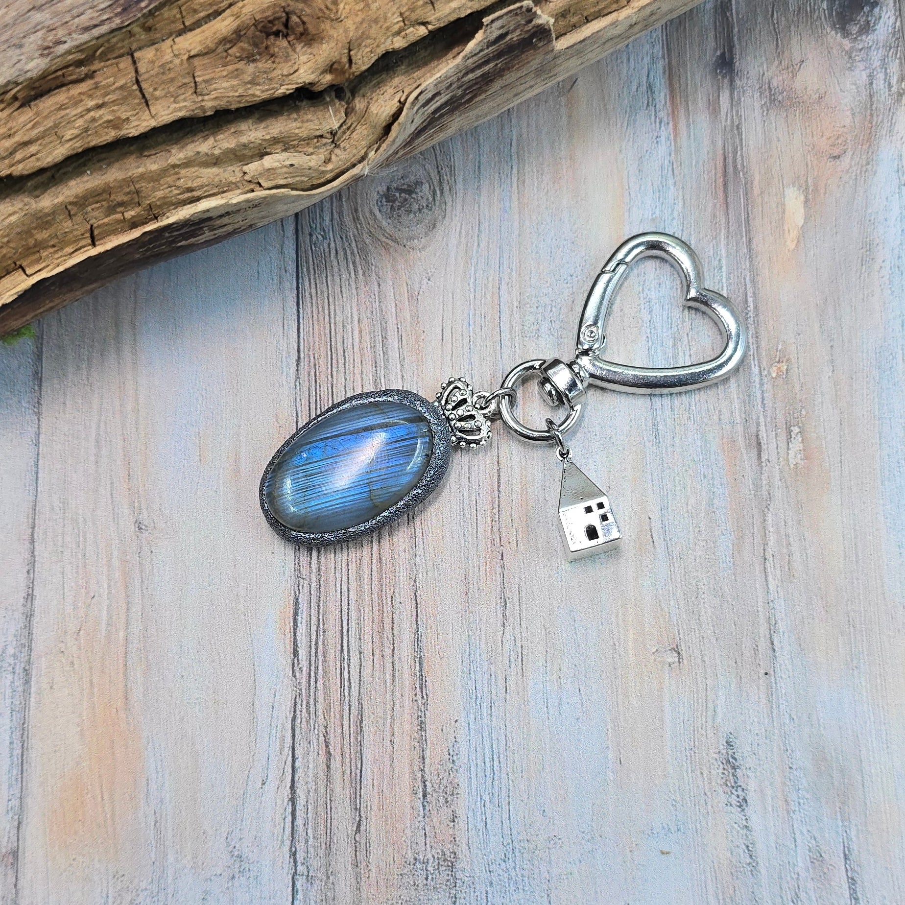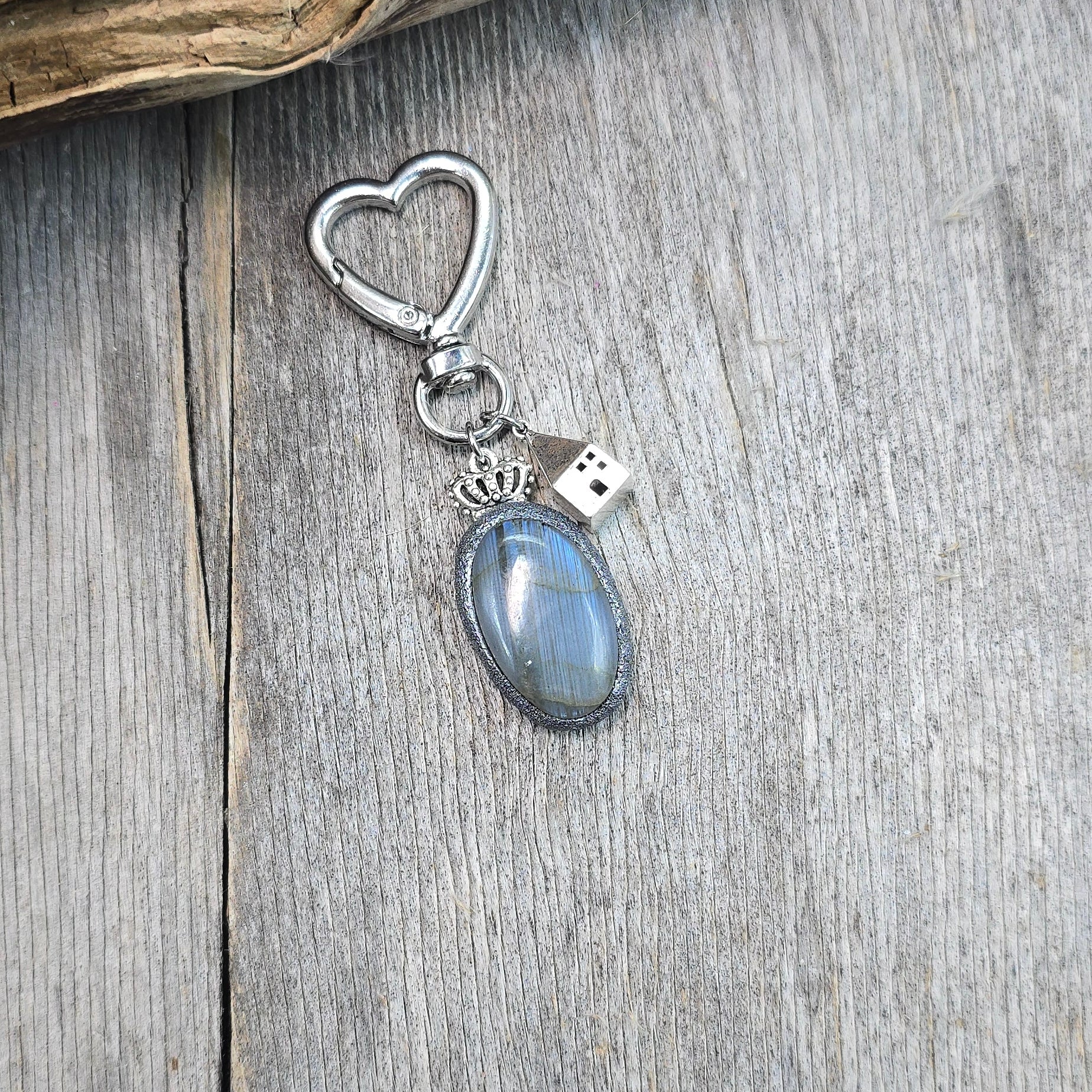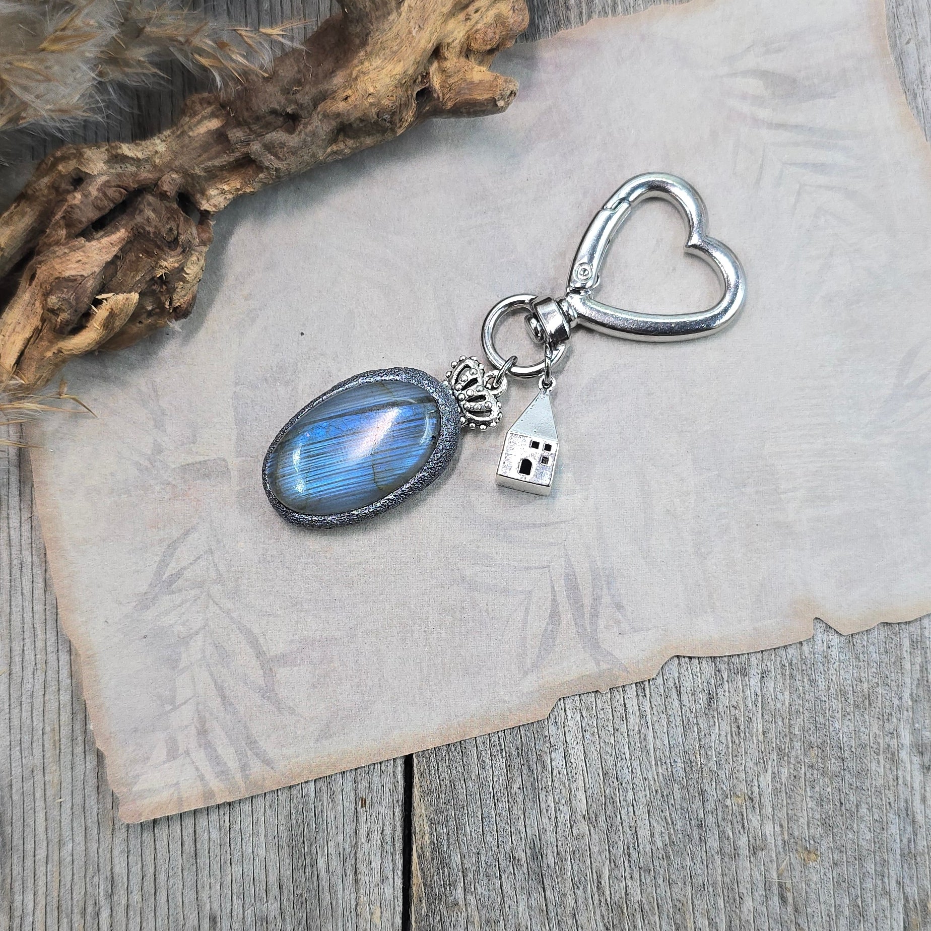 Šis nedidelis, bet ypatingas raktų pakabukas – tai ne tik papuošimas ar funkcionalus daiktas, bet ir tylus tavo ar mylimo žmogaus sargas. Jo širdyje slypi natūralus labradorito akmuo – akmuo, kuris nuo seno laikomas apsaugos, intuicijos ir vidinės stiprybės simboliu.
