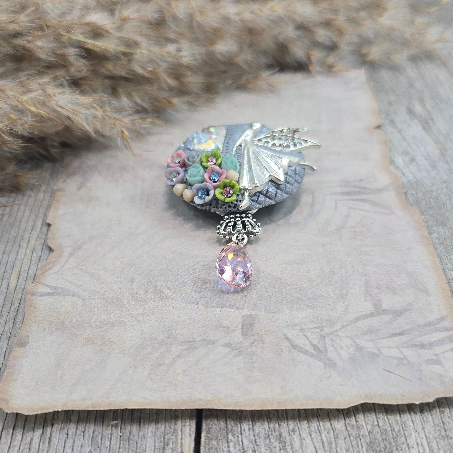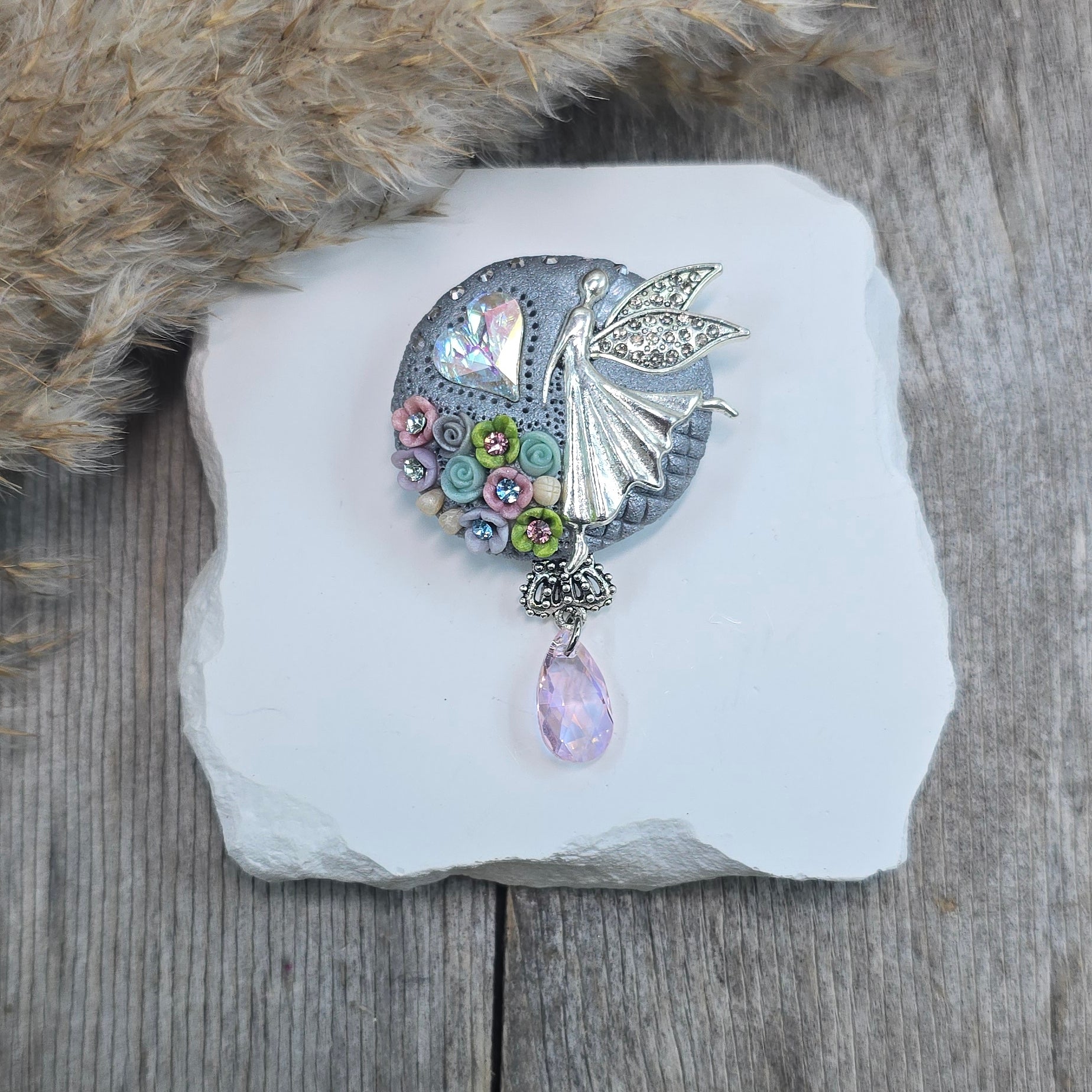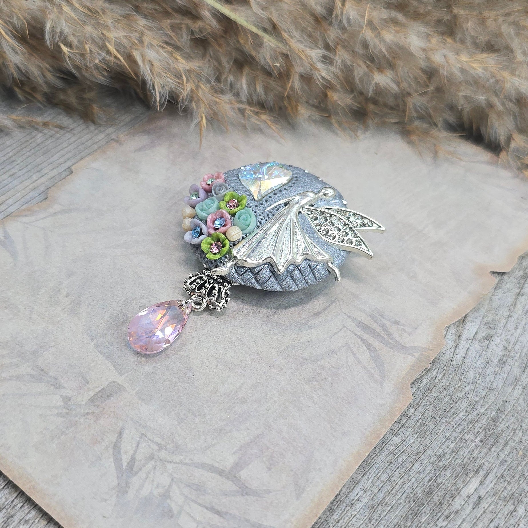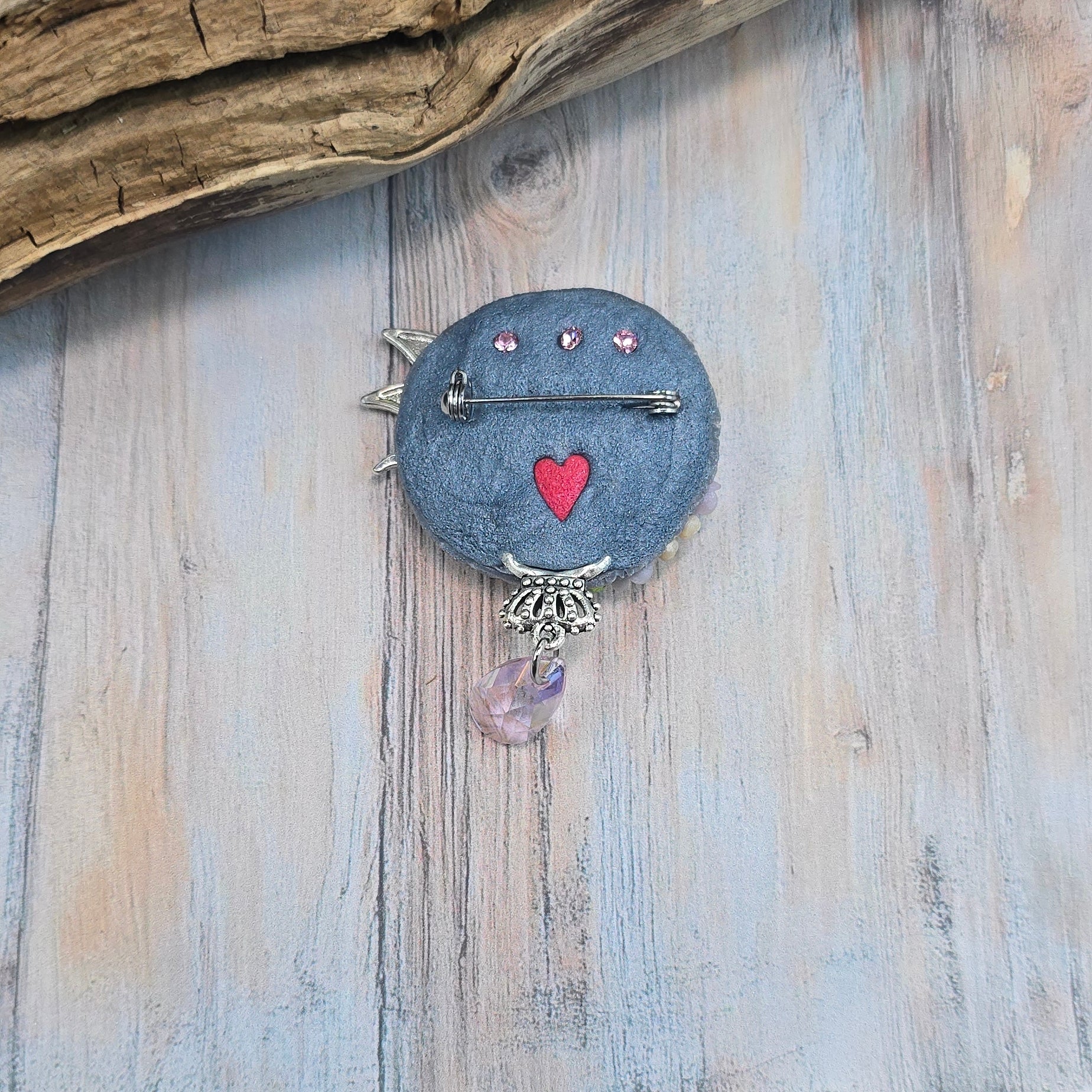 Rankų darbo sagė iš polimerinio molio. Kitoje pusėje yra smagi širdelė.