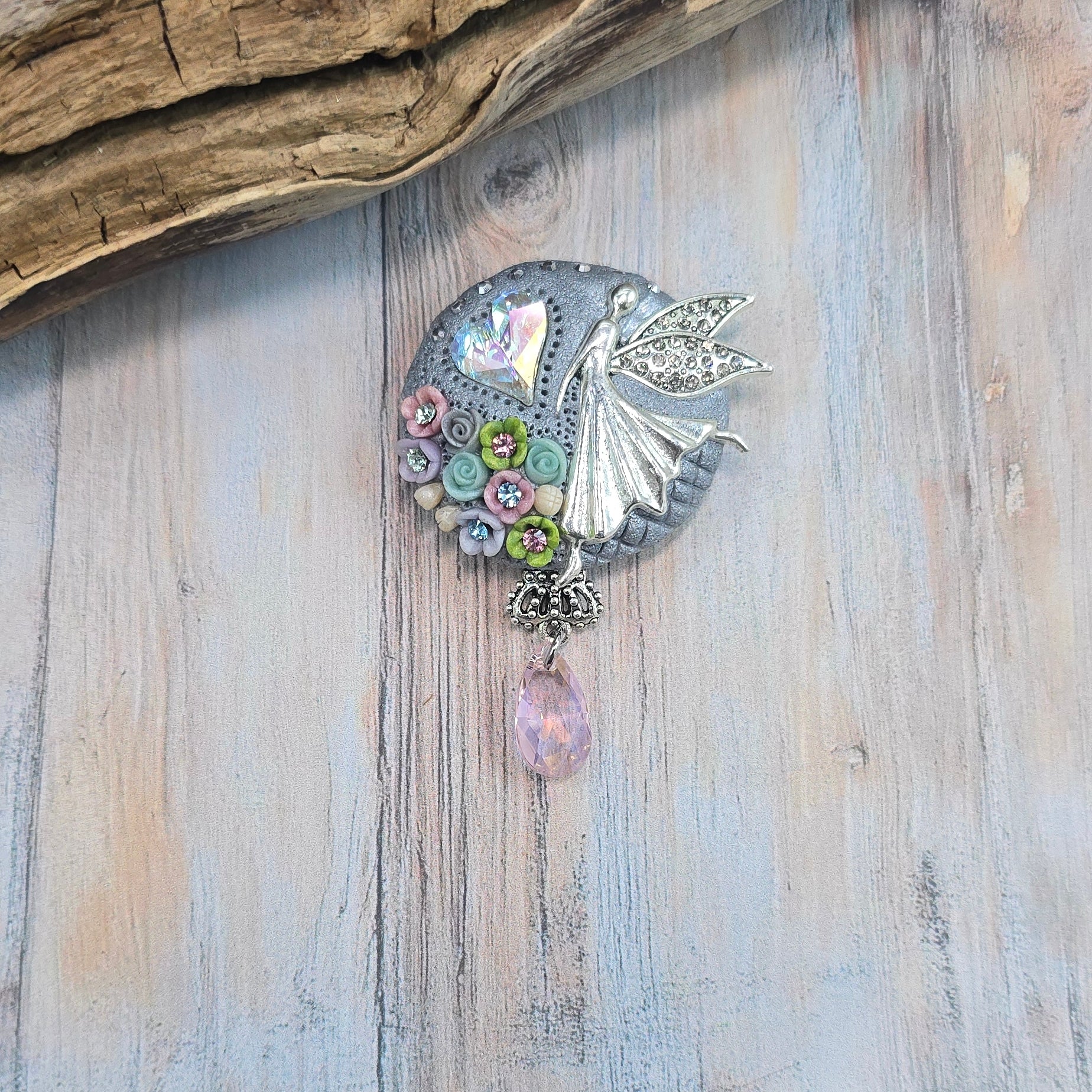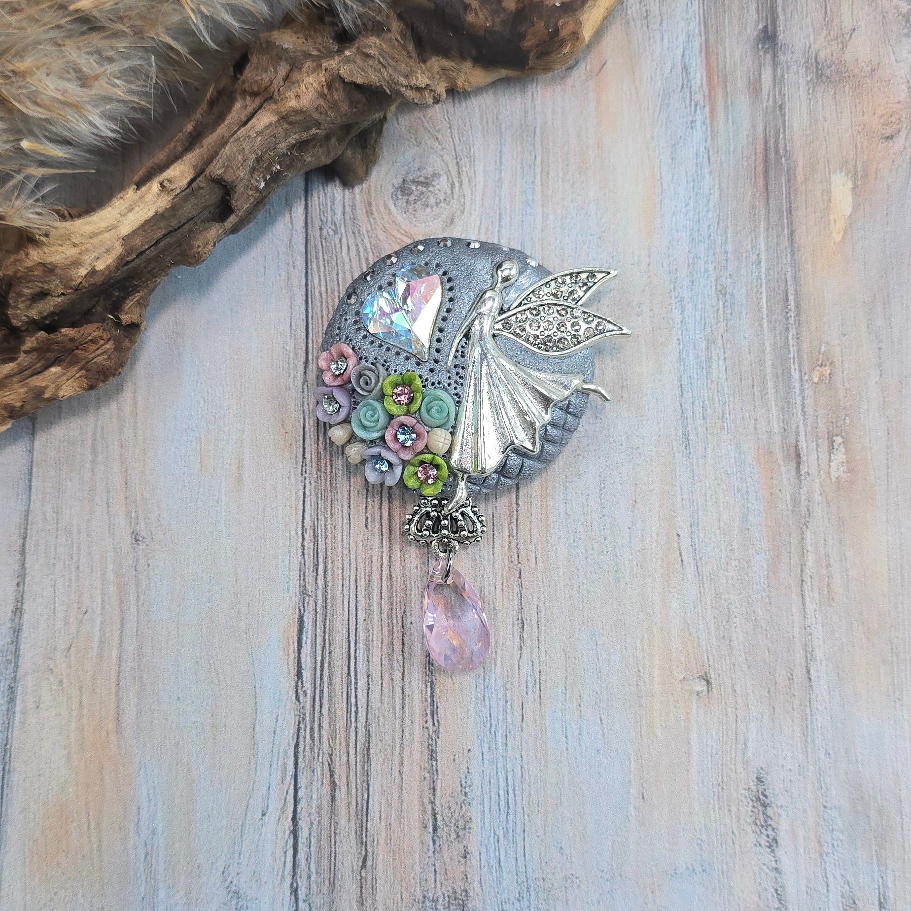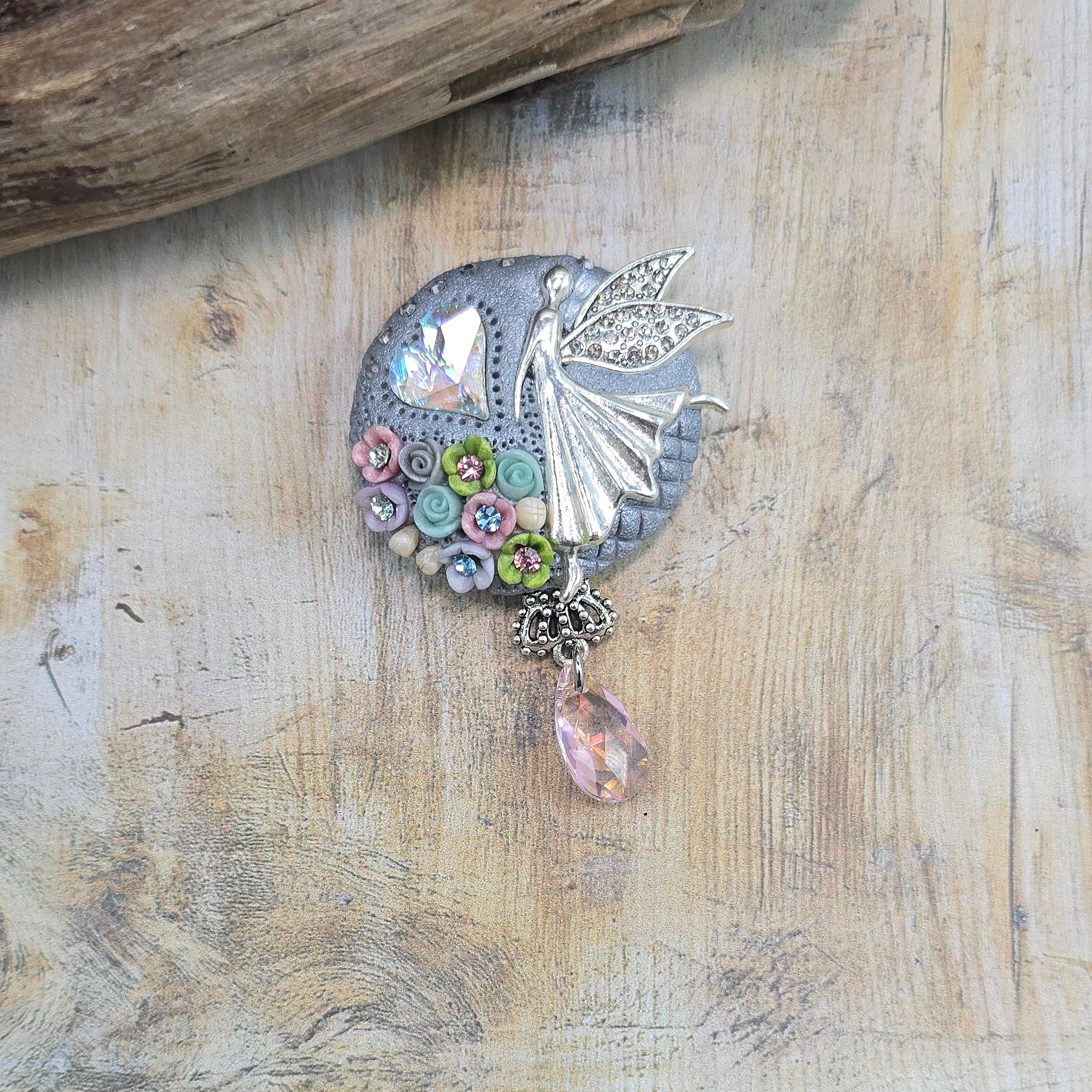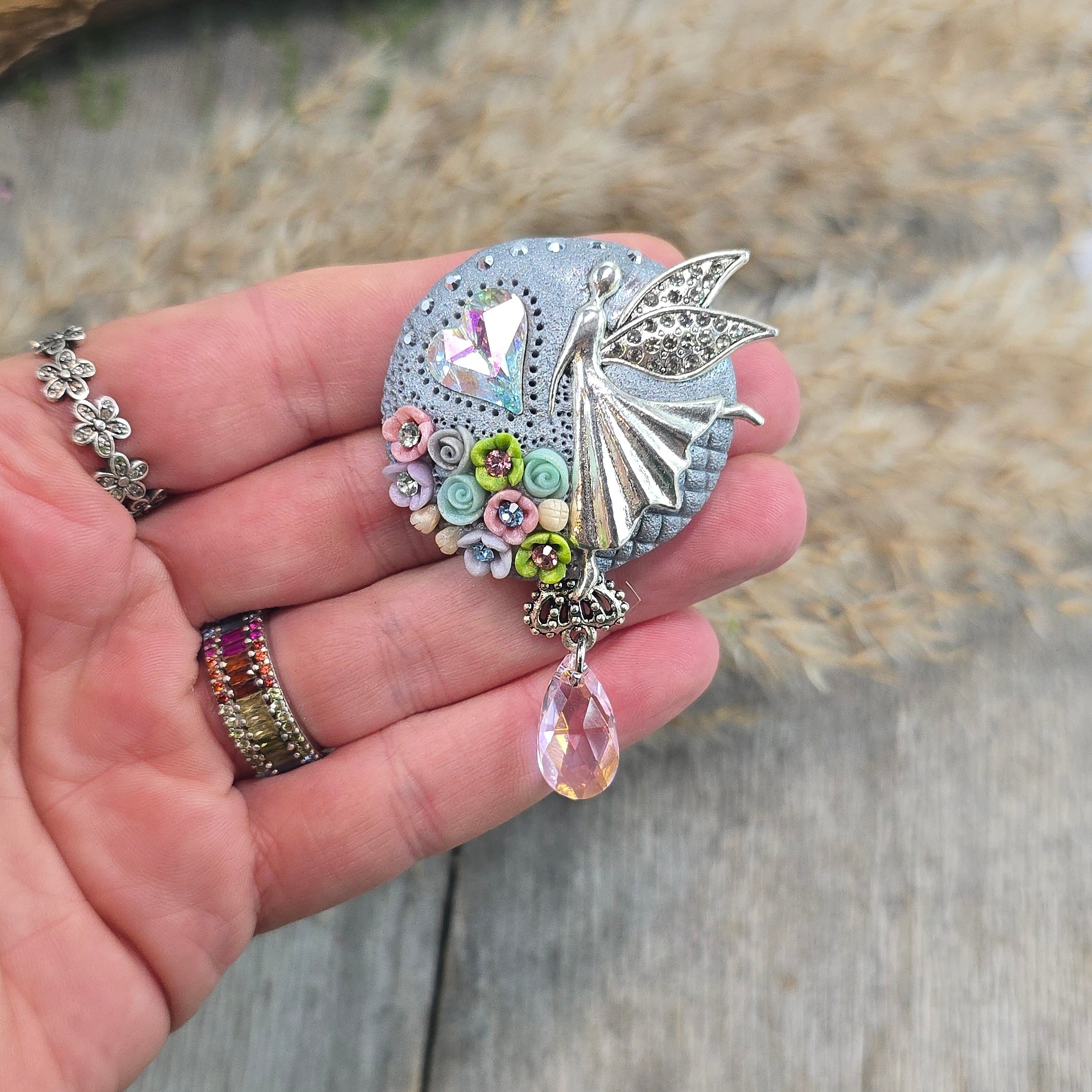 Rankų darbo sagė iš polimerinio molio. Kitoje pusėje yra smagi širdelė.