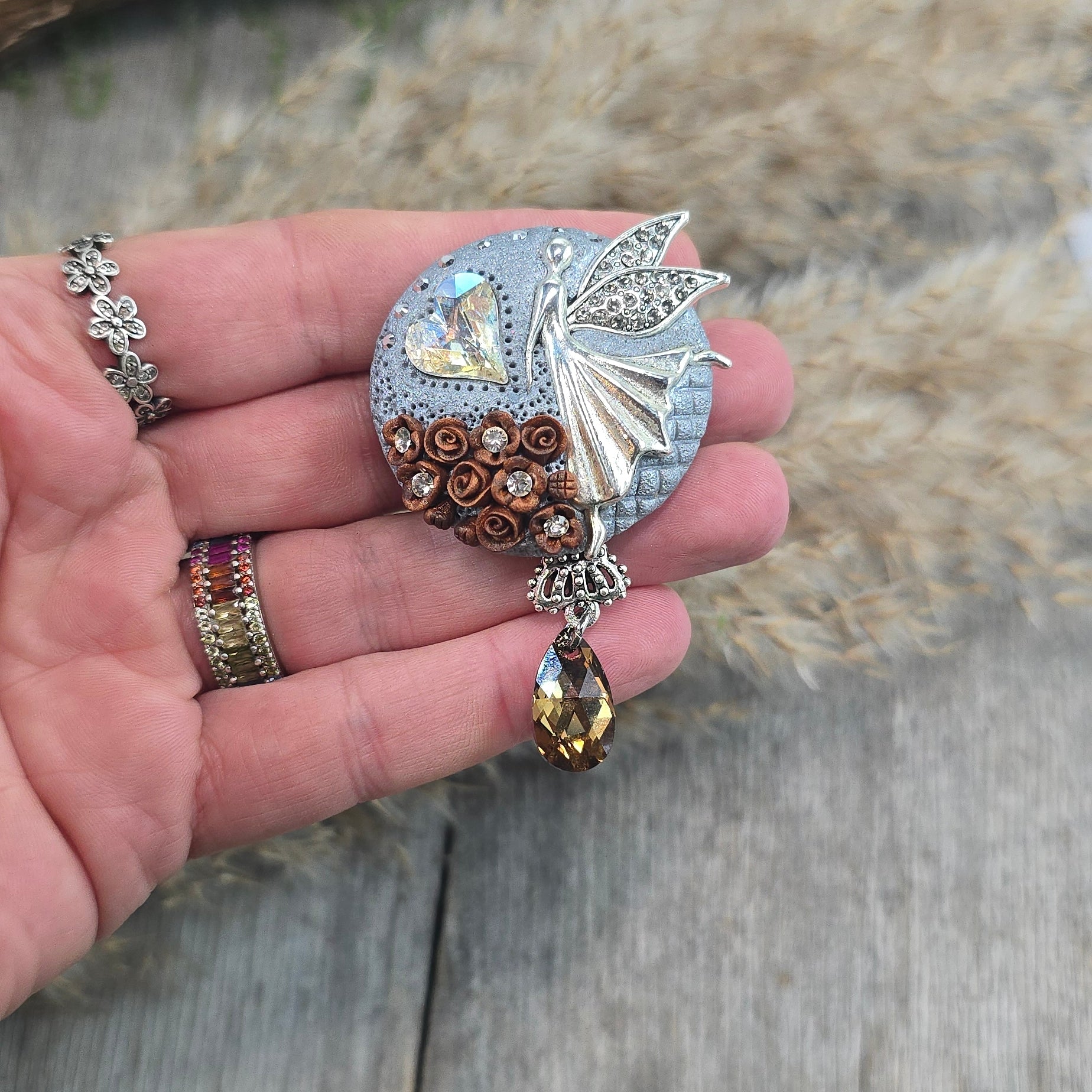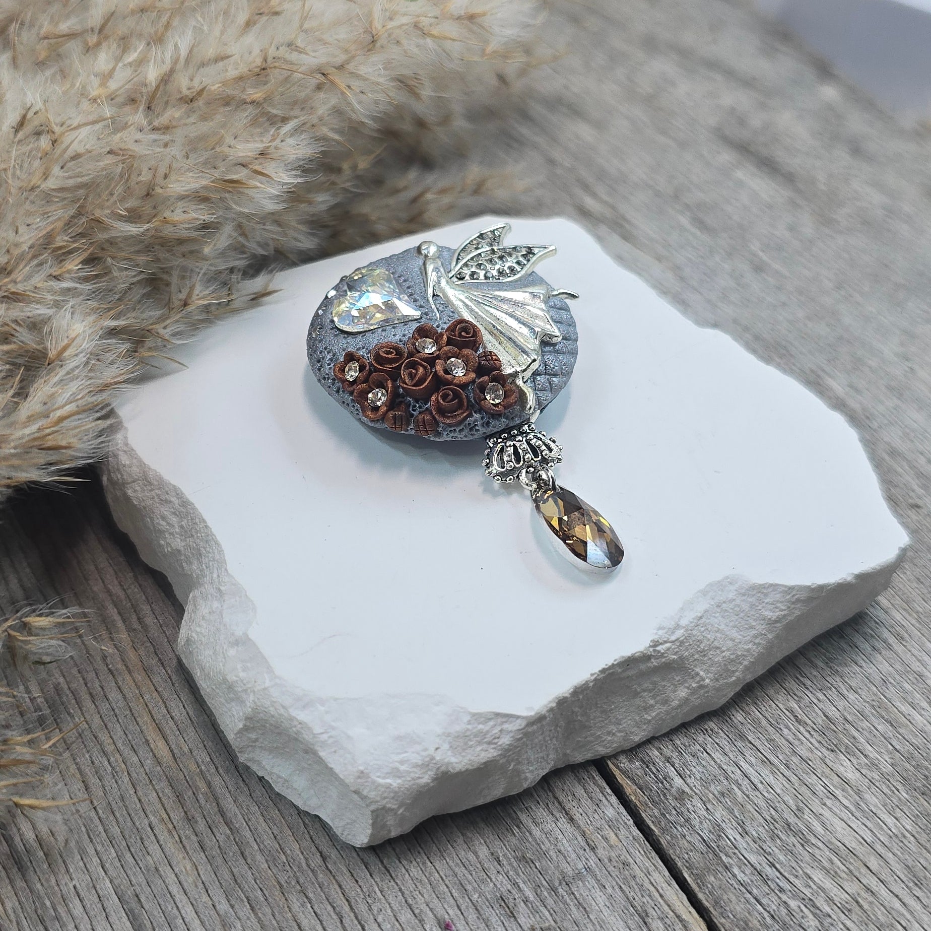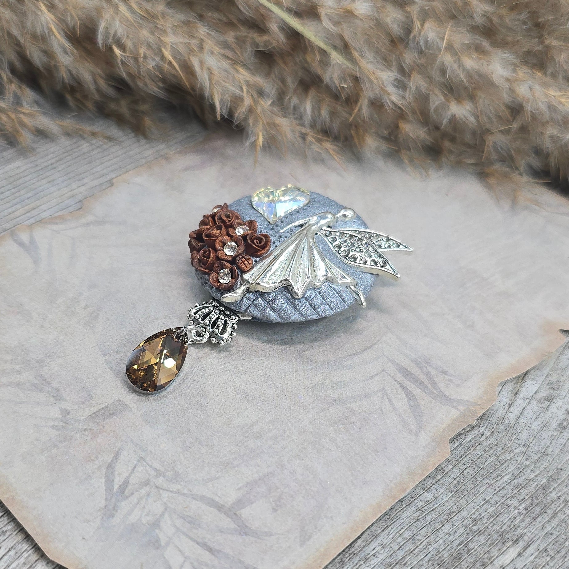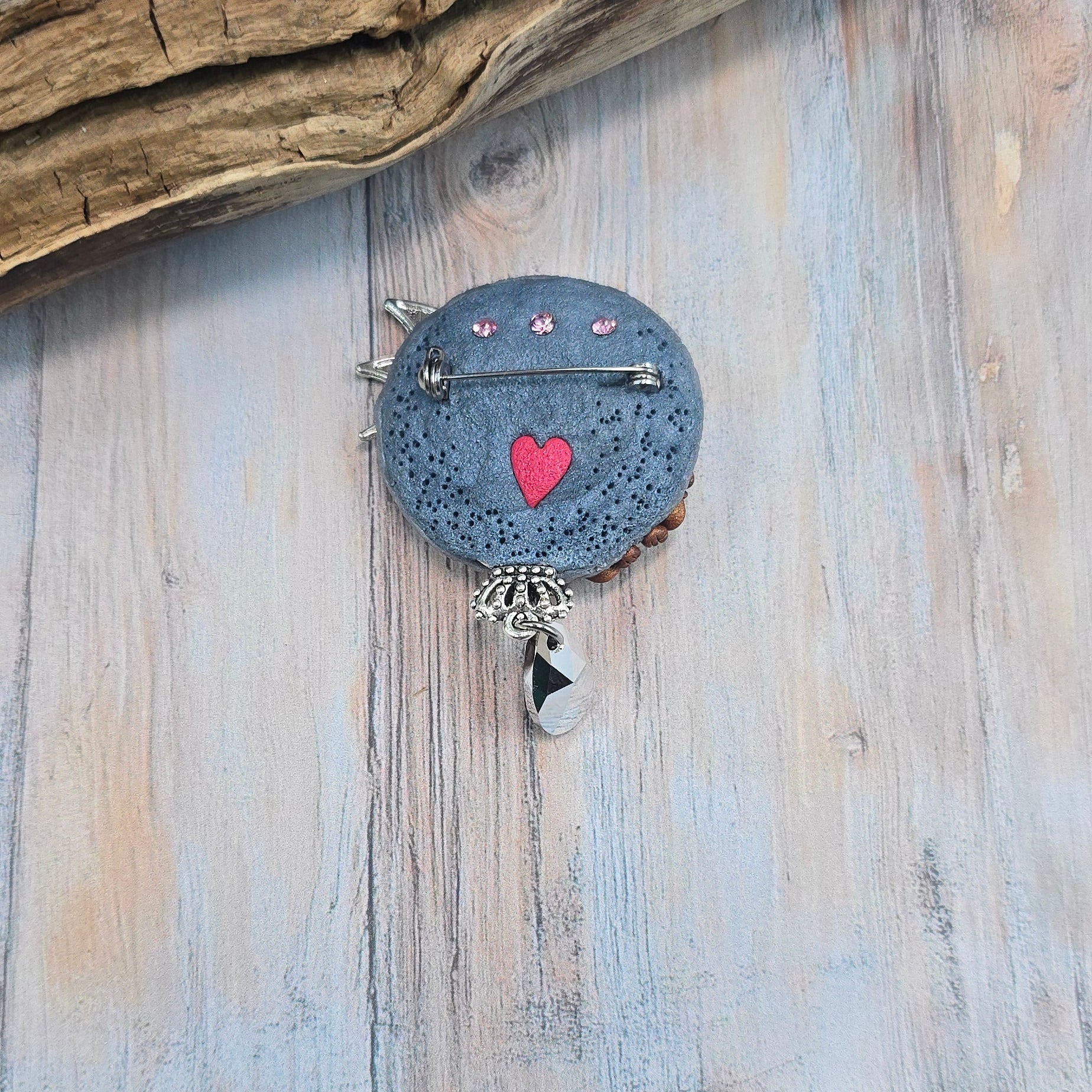 Rankų darbo sagė iš polimerinio molio. Kitoje pusėje yra smagi širdelė.