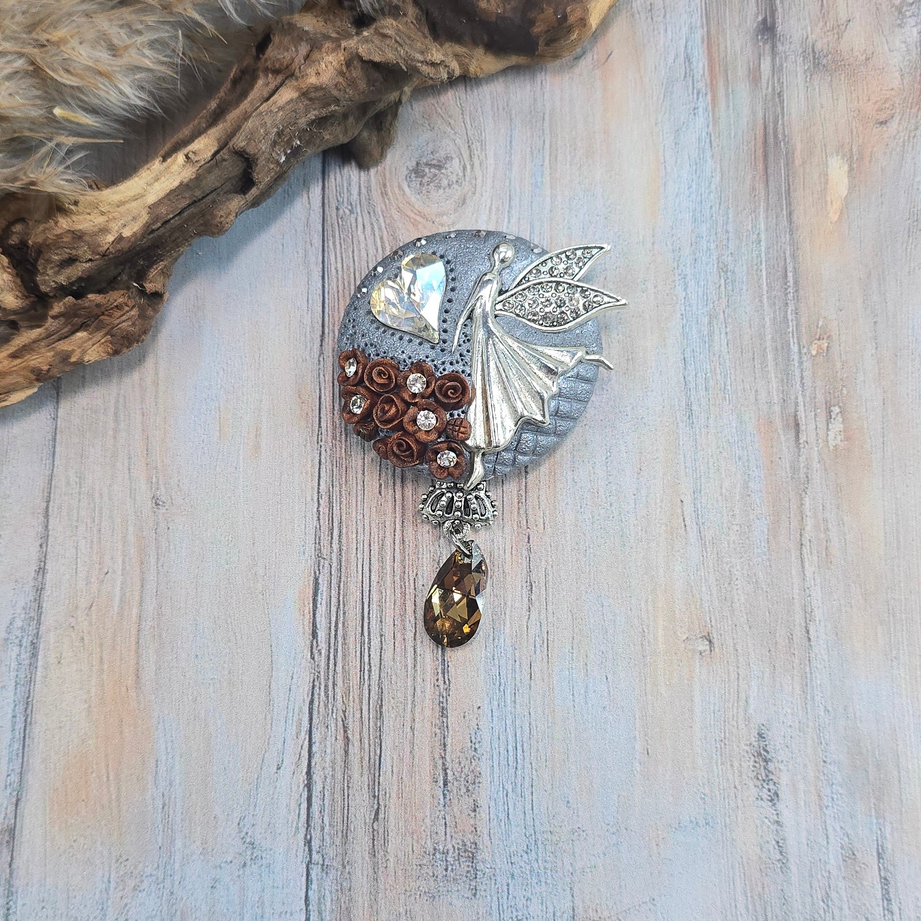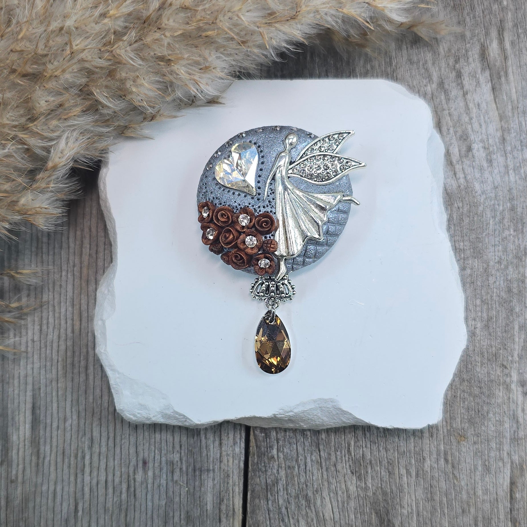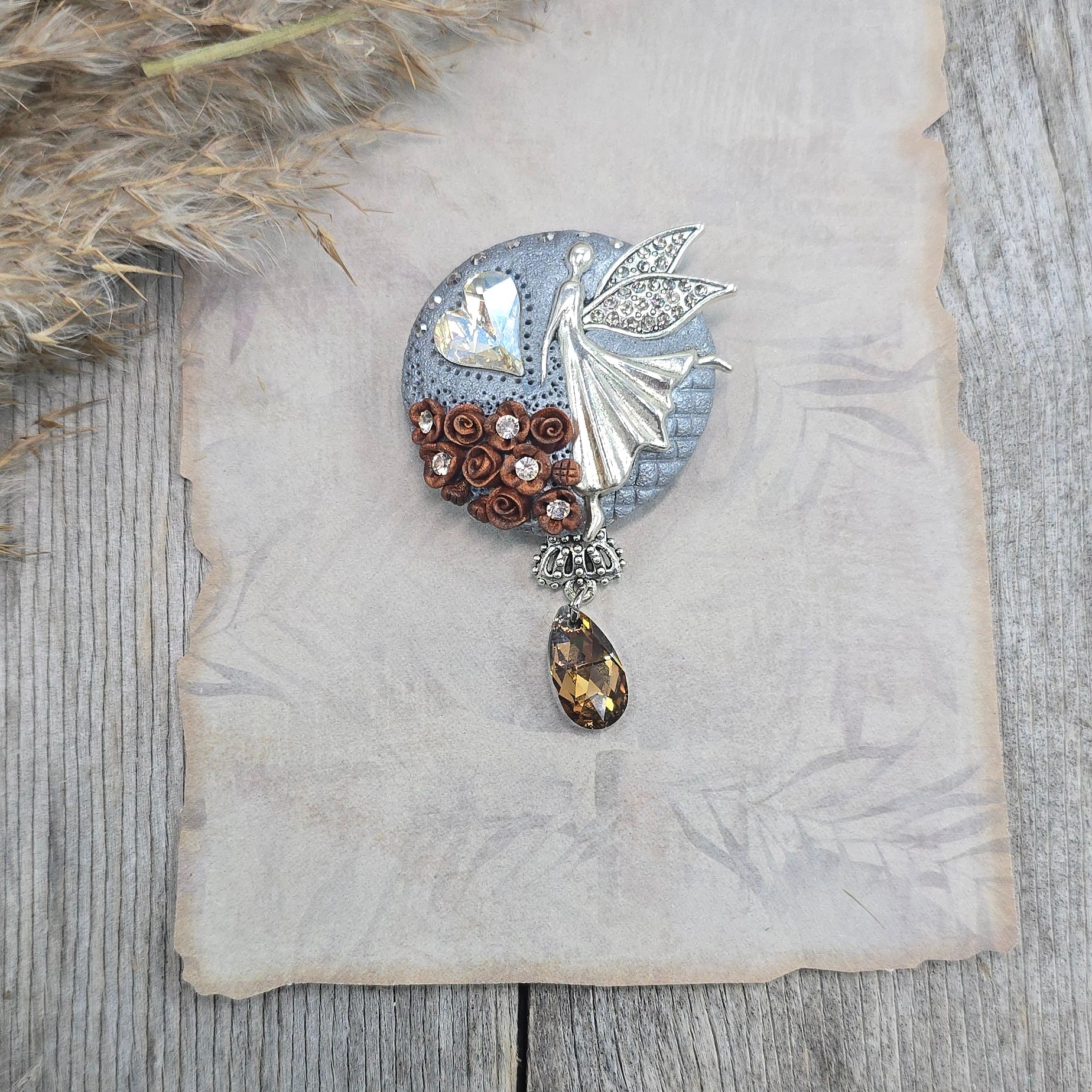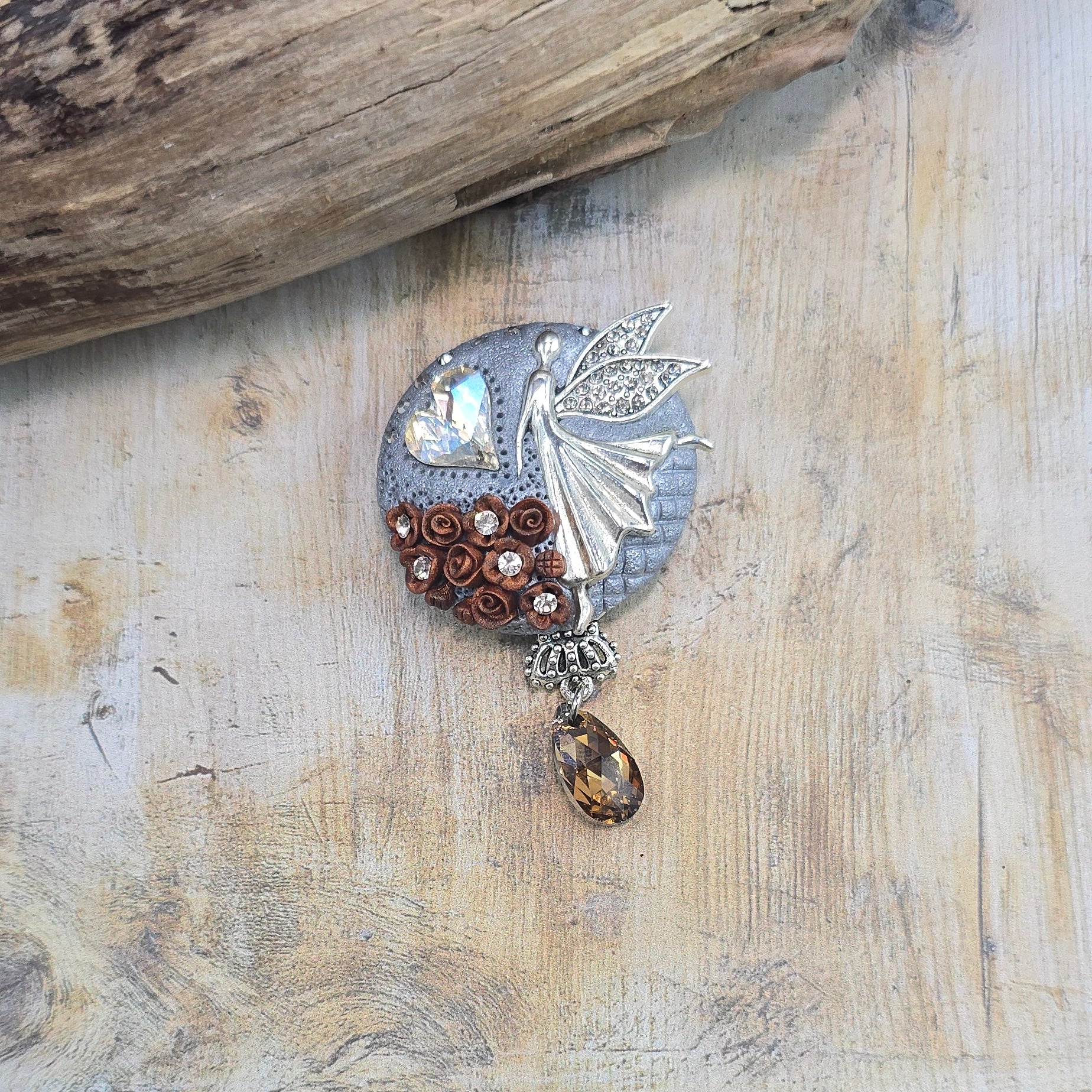 Rankų darbo sagė iš polimerinio molio. Kitoje pusėje yra smagi širdelė.
