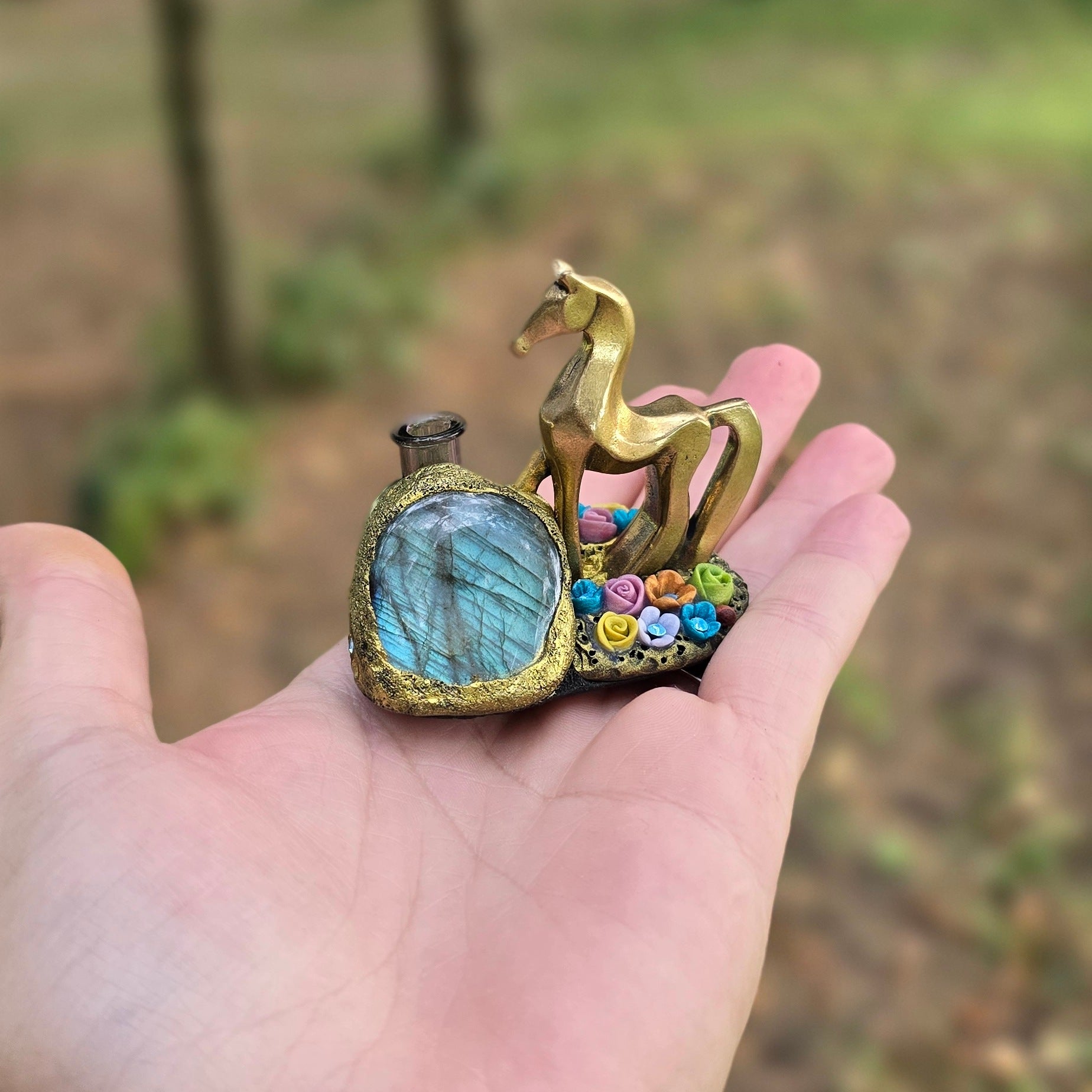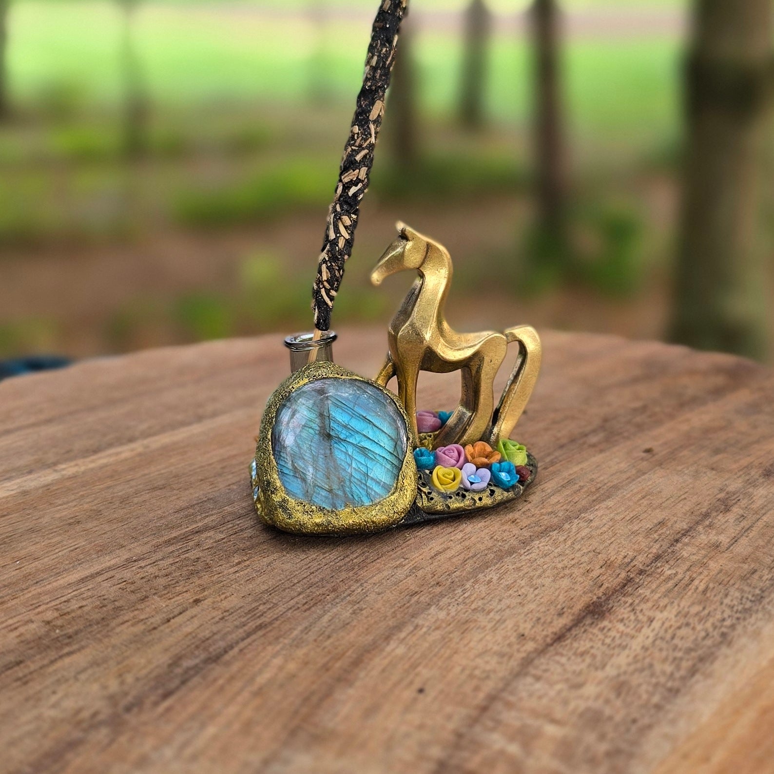 Medžiagos: žalvaris, stiklas, labradoritas, polimerinis molis, kristalai