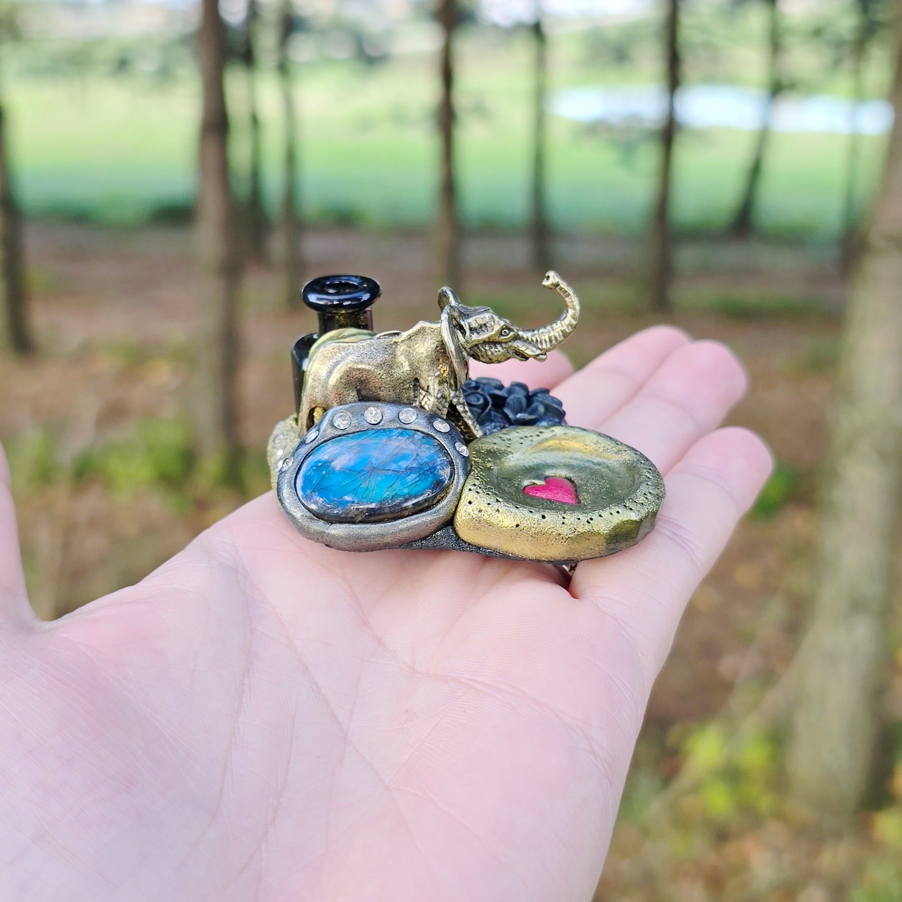 Medžiagos: žalvaris, stiklas, labradoritas, polimerinis molis, kristalai