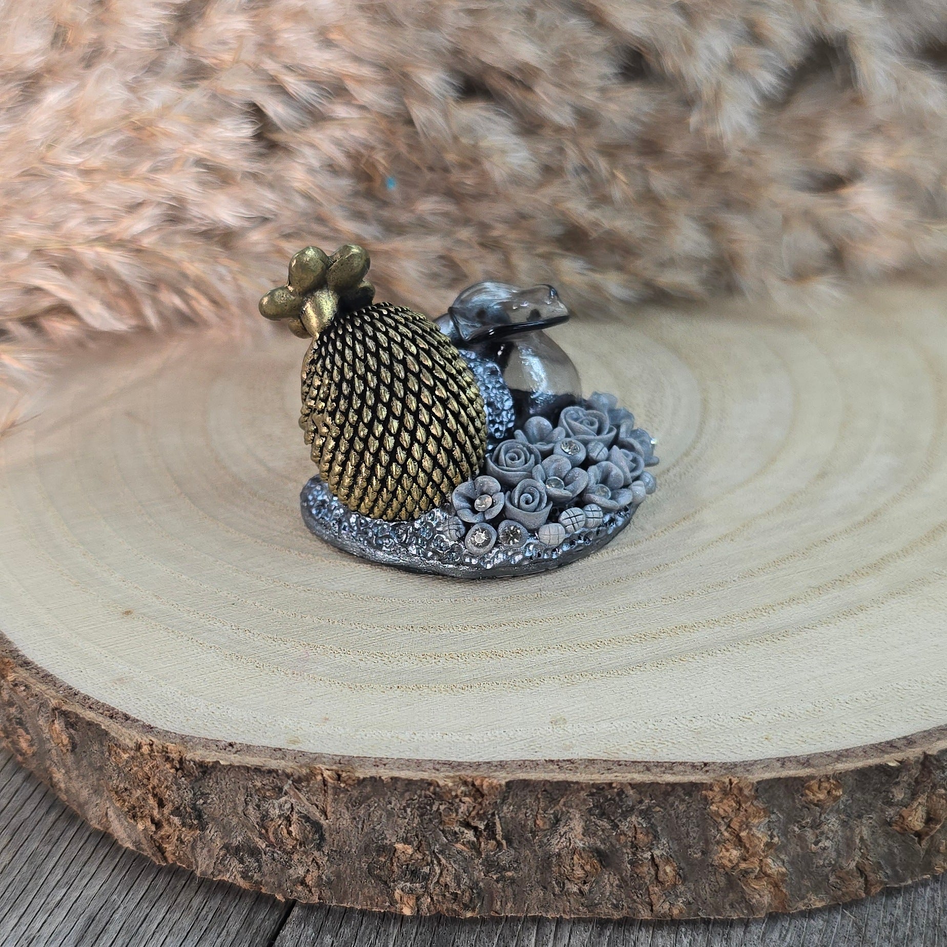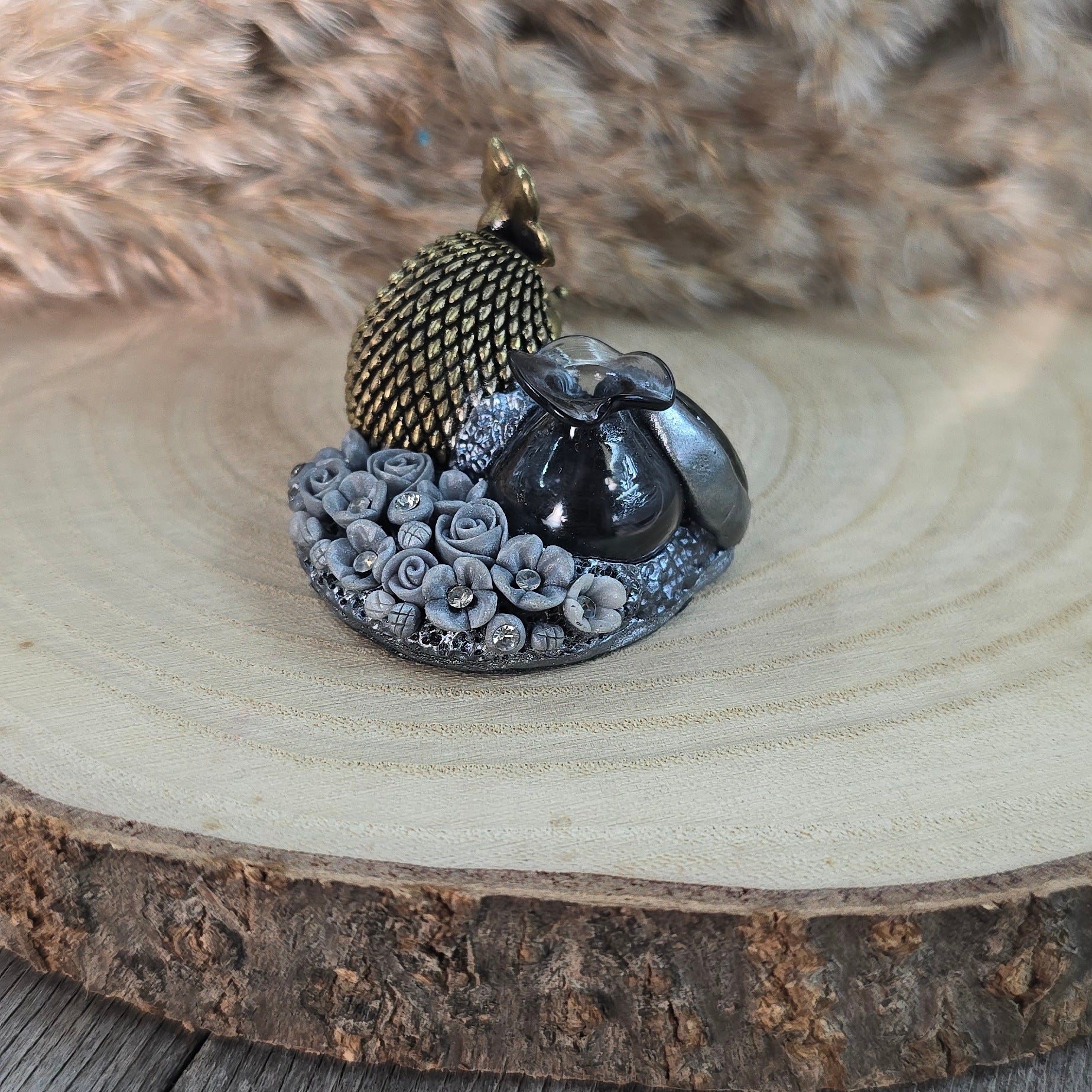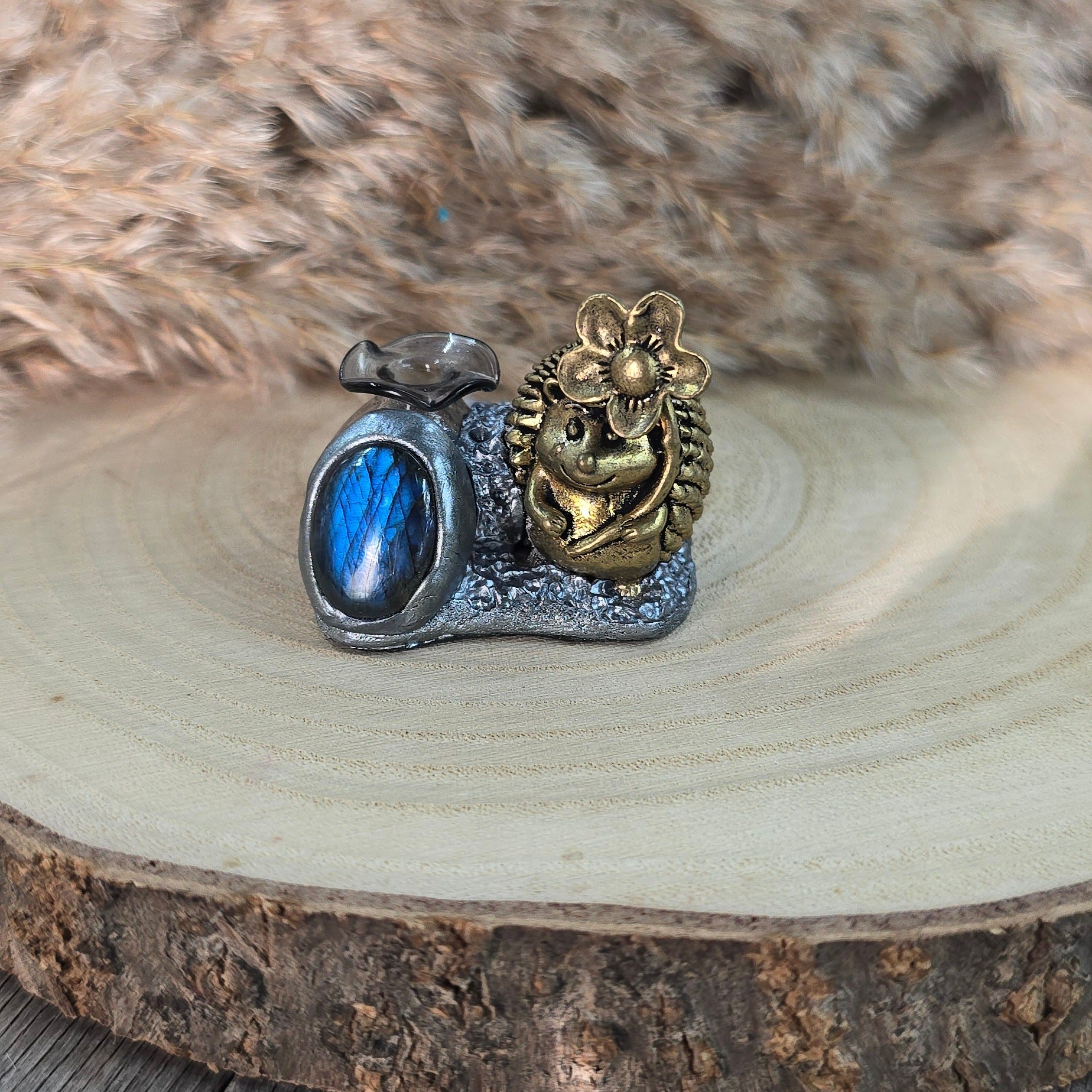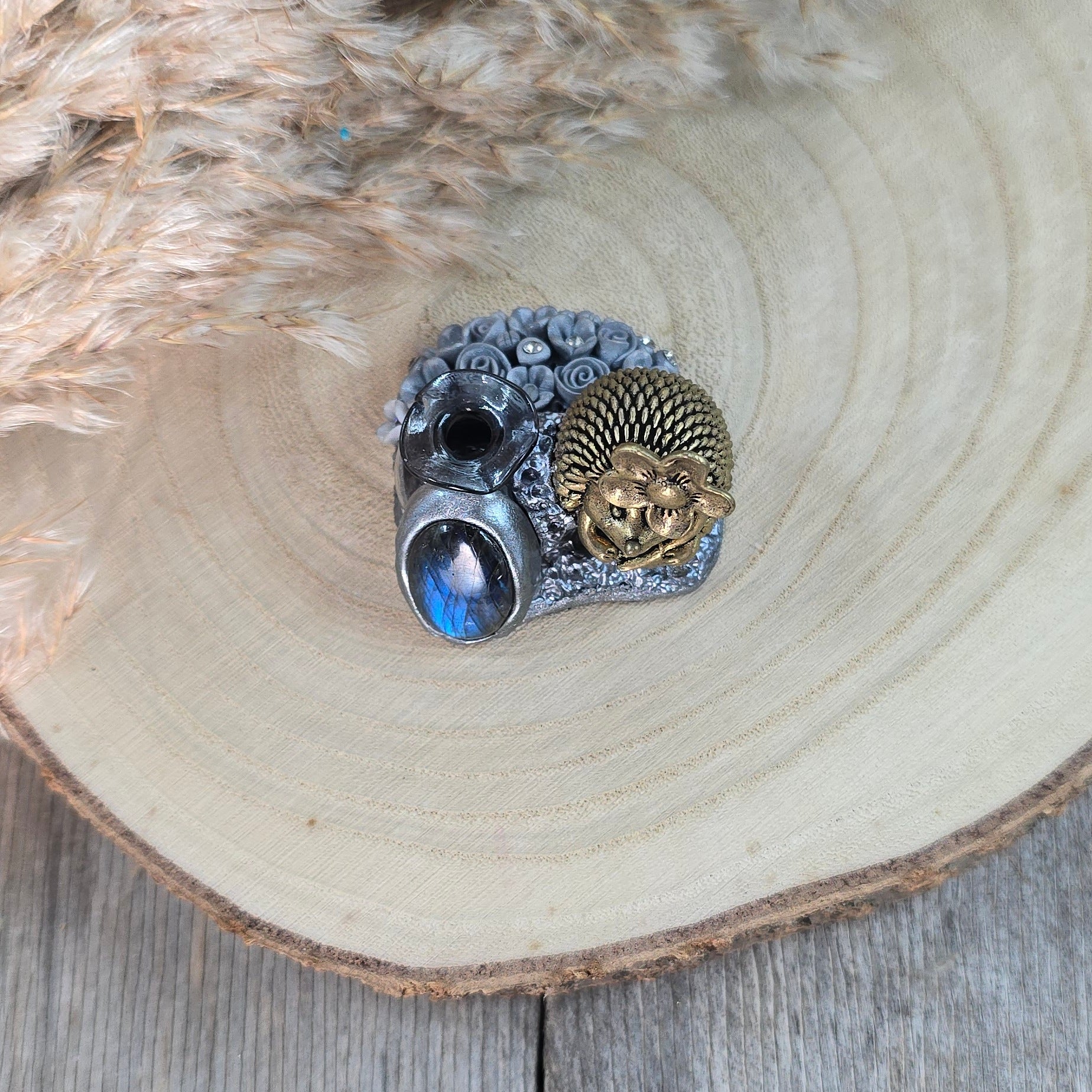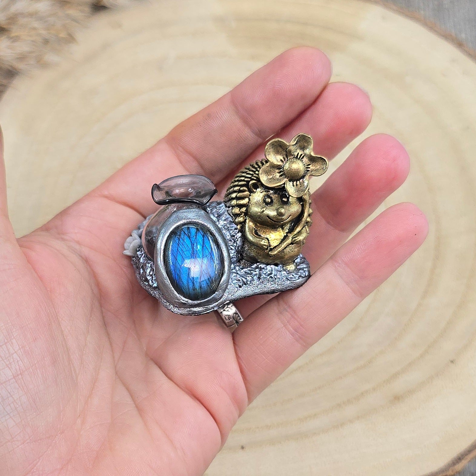 Medžiagos: žalvaris, stiklas, labradoritas, polimerinis molis, kristalai